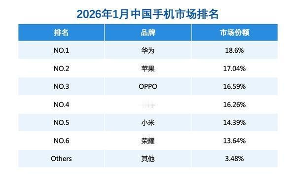 华为再夺第一!友商倍感压力! 根据权威机构公布的第三方销量数据,华为领跑新年手机市场,拿到1月份中国手机市场份额第一名,市场份额提升至18.6%。力压苹果、OPPO、vivo、小米、荣耀等厂商,开门红如此势如破竹,不难想象 ,2026年全年,华为又要大杀四方了,部分友商怕是要睡不着咯~