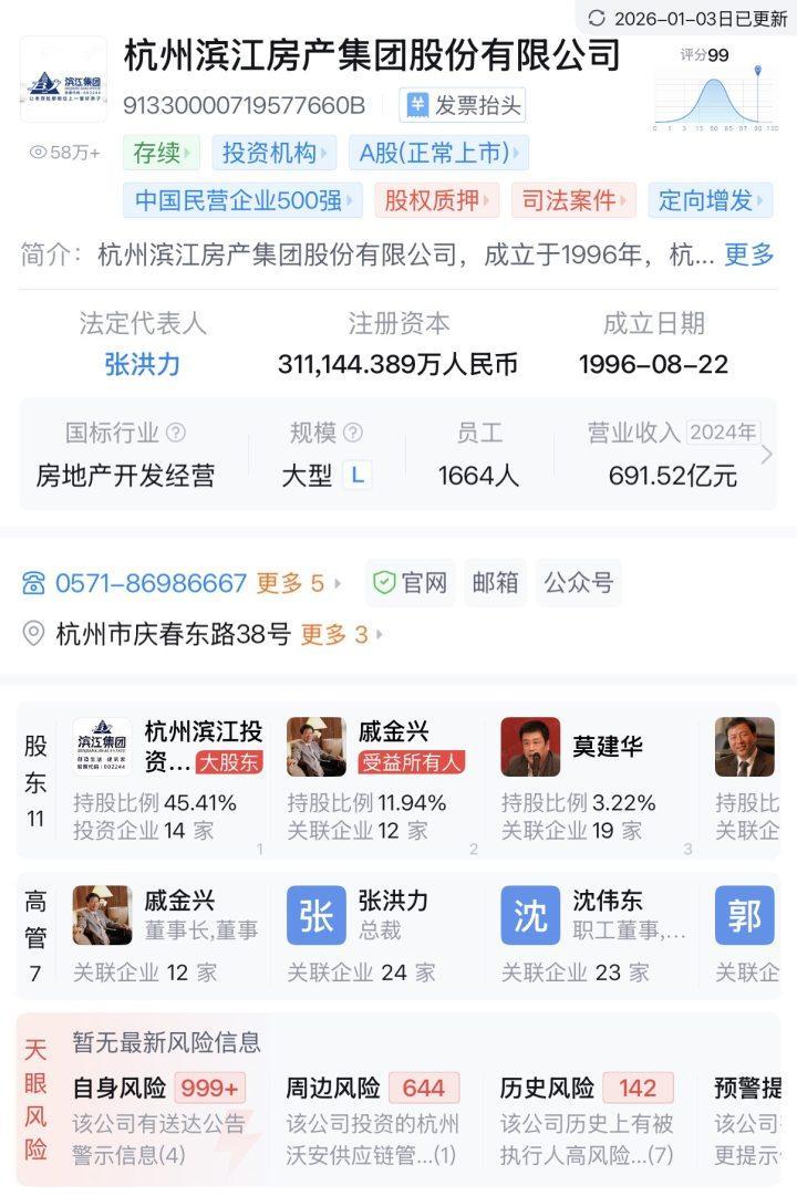 杭州滨上投资管理有限公司,系滨江集团100%控股子公司,涉案金额高达9780.76万元,其法人黄安于2026年1月6日被采取限制高消费措施;