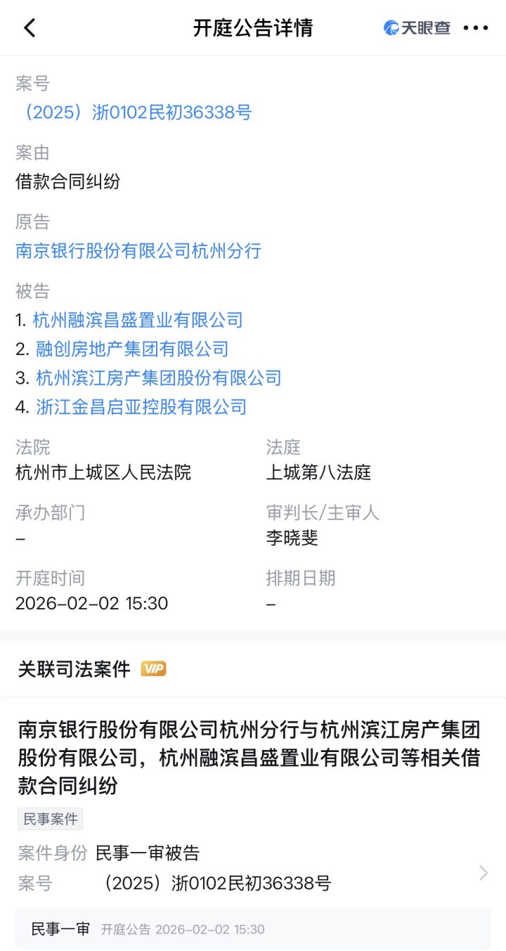 天眼查信息还显示,2月2日下午3时30分,杭州市上城区人民法院将开庭审理一起银行借款合同纠纷案件,滨江集团亦在被告之列。该案被告共4家,分别为杭州融滨昌盛置业有限公司、融创房地产集团有限公司、杭州滨江房产集团股份有限公司及浙江金昌启亚控股有限公司。