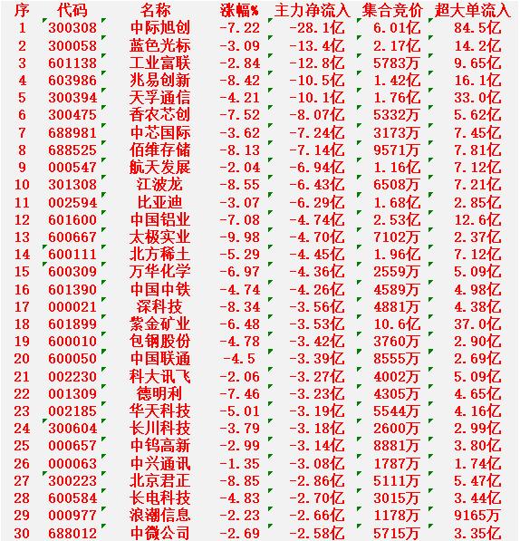 2月2日上午盘,主力趁低位,大幅买入的30名单 中超控股:涨幅 9.96%,净流入 9.87亿元。 贵州茅台:涨幅 2.92%,净流入 8.25亿元。 利欧股份:涨幅 7.62%,净流入 7.83亿元。 西部材料:涨幅 9.99%(接近涨停),净流入 7.66亿元。 胜宏科技:涨幅 2.05%,净流入 6.56亿元。 2月2日中午收盘,主力资金“大幅卖出”的30名单: 中际旭创:跌幅 7.22%,净流出 28.1亿元。 蓝色光标:跌幅 3.09%,净流出 13.4亿元。 工业富联:跌幅 2.84%,净流出 12.8亿元。 兆易创新:跌幅 8.42%,净流出 10.5亿元。 天孚通信:跌幅 4.21%,净流出 10.1亿元。