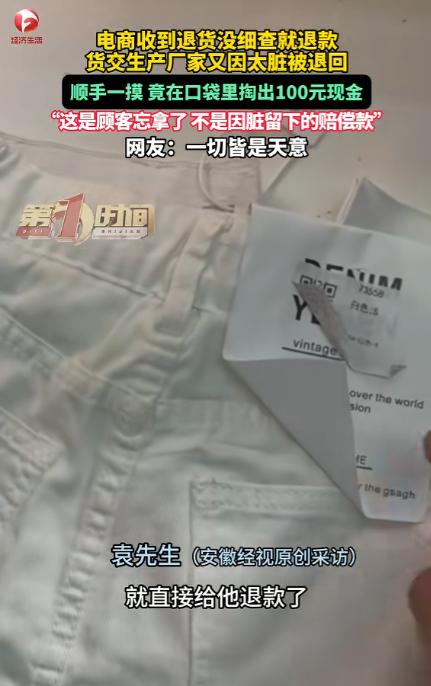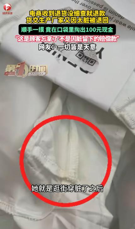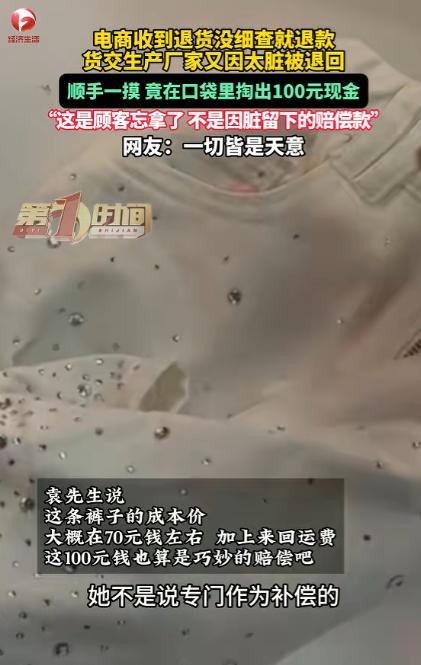 天意!广东,一店主收到顾客退回来的裤子,见裤子完好无损,而且吊牌也在,也没细看,就把70多块钱的货款退给了对方,万万没想到,他把裤子退给工厂后,工厂又把裤子退回来了,说裤子被人穿过,裤裆那都是黄的,就在店主惆怅之际,却发现裤子口袋里居然有100块钱!网友:这真的是天意! 袁老板经营服饰电商有些年头了,线上做平价服饰零售,主打性价比,客单价都不高,平日里除了打包发货、对接快递,大部分精力都花在处理售后退货上。 做过电商的都清楚,平台有严格的售后处理时效要求,收到顾客退货后 48 小时内要完成审核操作,要是超时不处理,系统会自动判定退款,不仅会损失货款,还会影响店铺的体验分和纠纷商责率,对后续的店铺流量和经营影响不小。 所以袁老板平时处理退货,向来都是本着多一事不如少一事的原则,只要拆开包裹看到商品外观平整、吊牌没拆、包装完好,基本都会爽快退款,毕竟小本生意,不想因为几十块的东西跟顾客起纠纷,也怕因小失大影响店铺运营。 前段时间,袁老板像往常一样处理售后,当天收到一个退货包裹,是一位顾客寄回的裤子,顾客在退货留言里只简单写了 “尺寸不合适,申请退货退款”,没有附带任何图片。 他随手拆开快递外包装,拎起这条裤子看了看,面料摸起来平整,裤腰上的吊牌好好挂着,没有被剪开或脱落的痕迹,裤身也没有明显的褶皱和污渍,咋看之下就是全新未穿的状态。 袁老板也没多想,更没把裤子翻过来检查内里,毕竟按以往的经验,吊牌完好的退货,基本都不会有问题,他直接在电商后台点了确认,把 70 多块的货款原路退还给了这位顾客。 退完款后,他把这条裤子和其他几件顾客退回、无质量问题的服饰放在一起,这是小店的常规操作,攒够一定数量的退货,就统一寄回工厂,让工厂做专业的质检、清洗和熨烫。 毕竟小店没有专门的质检设备和清洗场地,只有经过工厂处理,这些退货才能重新上架销售,减少损失。 本以为这单退货就这么顺顺利利结束了,袁老板也没再把这事放在心上,过了两三天,他把攒下的一批退货打包好,填好快递单寄去了工厂,想着等工厂处理完,这批货就能重新回到货架上。 可谁也没想到,隔了两天,工厂那边的工作人员就主动打来了电话,语气很明确地说有一条裤子质检不过关,要按规定拒收,还单独把这条裤子寄回了袁老板的店里。 工厂工作人员在电话里详细说明,这条裤子看着外表没问题,但内里明显有穿着痕迹,裤裆部位有发黄的污渍,还带着淡淡的汗味,根本达不到二次销售的标准,就算清洗也很难去除污渍,只能退回给商家自行处理。 袁老板接到电话的时候心里咯噔一下,瞬间意识到自己这次大意了,赶紧拆开工厂寄回的包裹,把这条裤子翻来覆去仔仔细细检查了一遍。 这才发现,裤裆处的黄渍藏得特别隐蔽,不翻到内里根本发现不了,吊牌虽然还完好挂着,但裤子的腰头内侧能看到轻微的汗渍,裤脚也有一点点蹭脏的痕迹,明眼人一看就知道是被人穿过的。 这时候袁老板的心里别提多惆怅了,不仅平白无故退了 70 多块的货款,还搭进去了寄往工厂和工厂寄回的两次快递费。 虽说钱数不多,但对于做平价服饰的小本生意来说,平白无故的损失还是让人心里不舒服,更让他无奈的是,这条裤子被穿脏成这样,自己就算清洗干净,也没法再卖出去,最后大概率只能当废品处理,想想都觉得亏。 袁老板捏着这条被拒收的脏裤子,坐在店里的打包凳上,又气又无奈,盯着裤子看了半天,也想不出什么好办法。 他随手把裤子搭在腿上,习惯性地伸手去掏裤子的口袋,想着清理一下口袋里可能有的杂物,就算不能卖,也得把裤子收拾干净。 结果手刚伸进裤子的侧缝小口袋,就摸到了一张硬邦邦、折得整整齐齐的纸钞,他愣了一下,下意识地把东西掏出来,展开一看,居然是一张崭新的 100 元现金,安安稳稳地藏在口袋深处,不仔细摸根本发现不了。 袁老板将这件事发到网上之后,引起了网友们的评论,有人被这突如其来的巧合打动,直言 “这也太神奇了,亏的钱不仅补回来了,还多了二十多,这就是天意吧”。 还有人忍不住调侃那位粗心的顾客,说 “估计顾客回头发现钱没了,还得在家到处找,怎么也想不到忘在退货的裤子里了,这波属实是偷鸡不成蚀把米”。 小生意靠的是诚信,做人做事亦是如此,耍小聪明或许能占一时的小便宜,但终究抵不过生活的巧思与公道,守着本心踏实做事,那些不经意的温暖与惊喜,总会在某个时刻如约而至。 对于这件事,您有什么想说的吗?欢迎评论区留言讨论。 信源:AHTV第一时间2026-01-29——《电商收到退货没细查就退款,交还生产厂家又因太脏被退回 ,顺手一摸竟在口袋里掏出100元…》