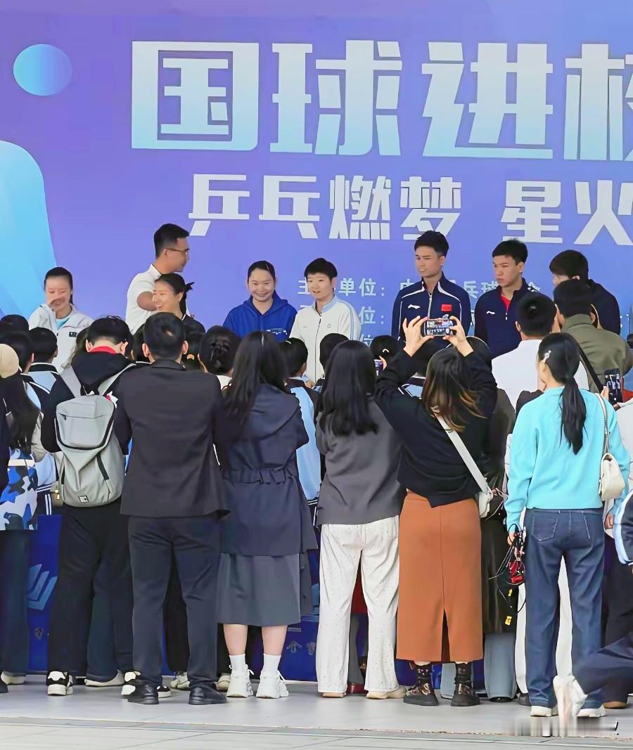 国乒进校园了, 孙颖莎、何卓佳、朱梓予三小支,去了海南, 没泡在训练场, 先去校园推广乒乓球。 乒乓球是中国传统优势项目, 现在随着年轻人打的越来越少, 感觉后继无人了! 让学生们近距离认识孙颖莎, 喜欢上乒乓球, 比拿一次冠军更有意义!