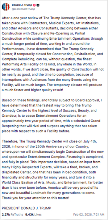 特朗普在“真实社交”上说,“这一决定是在与承包商、音乐专家、艺术机构及其他顾问进行为期一年的评估后做出的”。在权衡“边施工边营业”还是“彻底闭馆”的方案后,他认为,若选择在演出期间同步施工,不仅会严重干扰观众体验,且工程质量无法保障,工期也将大幅延长。
