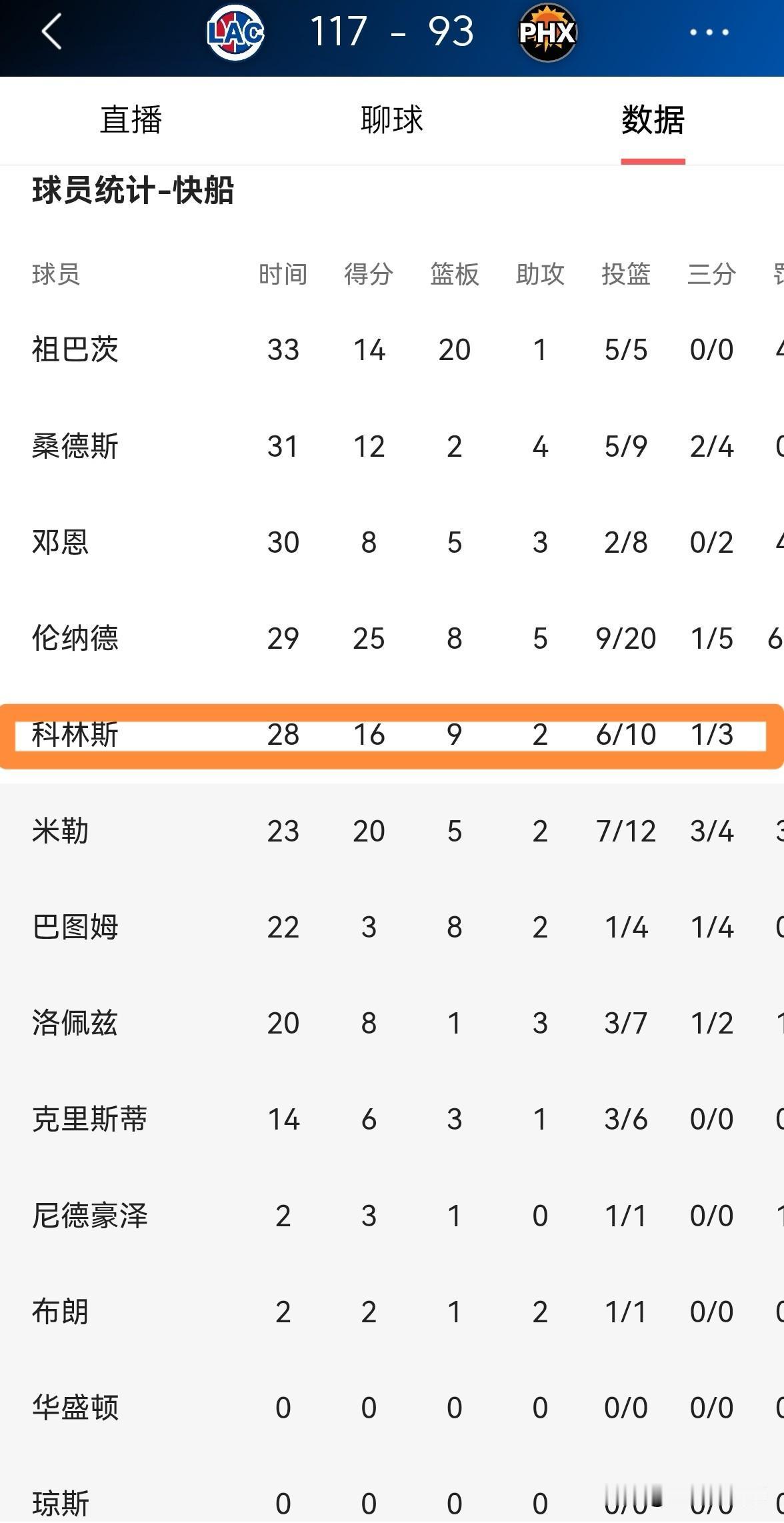 我真是越来越喜欢快船大将科林斯了!在今天快船客场以117:93大胜太阳的比赛中,能攻善守的科林斯再次打出了非常高效的表现。 全场比赛下来,科林斯首发出战28分钟,投篮10中6,其中三分球3中1、罚球4中3非常高效的得到16分,还有9篮板2助攻,没有出现失误,仅有1次犯规。 实事求是的说,如果快船想要顺利的杀进本赛季的季后赛,那么科林斯必须在接下来的比赛中延续自己的出色表现。