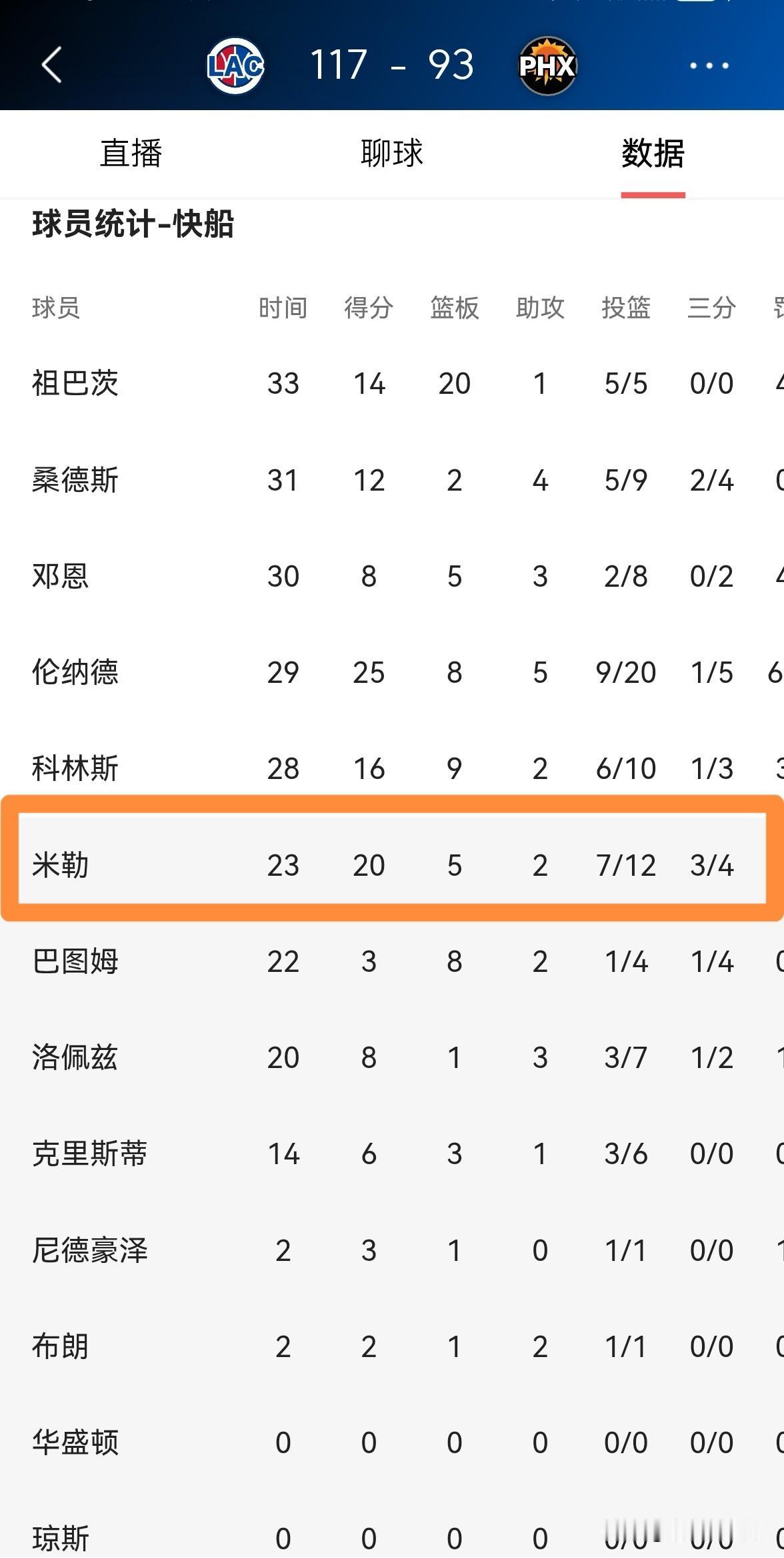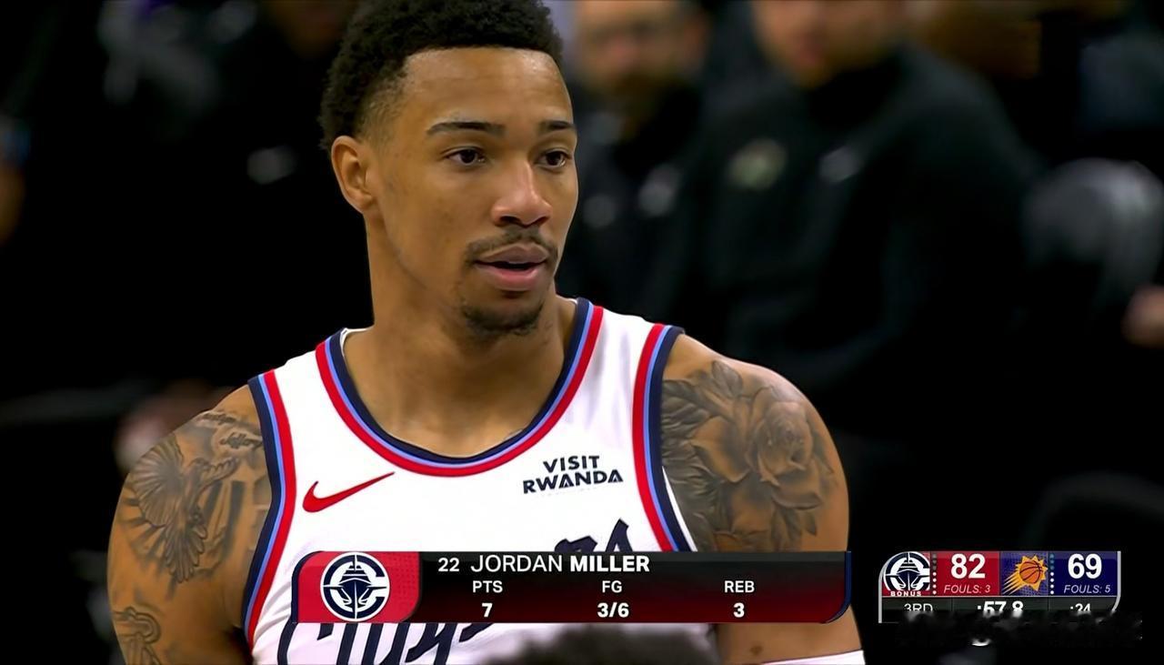 快船小将乔丹-米勒绝对可以取代哈登的位置!在今天快船客场以117:93战胜太阳的比赛中,米勒替补出战23分钟,投篮12中7,其中三分球4中3、罚球4中3非常高效的砍下20分,外加5篮板2助攻,他的场上正负值为+18。 事实证明,在哈登缺阵的情况下,米勒完全可以取代哈登的位置,米勒的表现甚至要强于哈登。