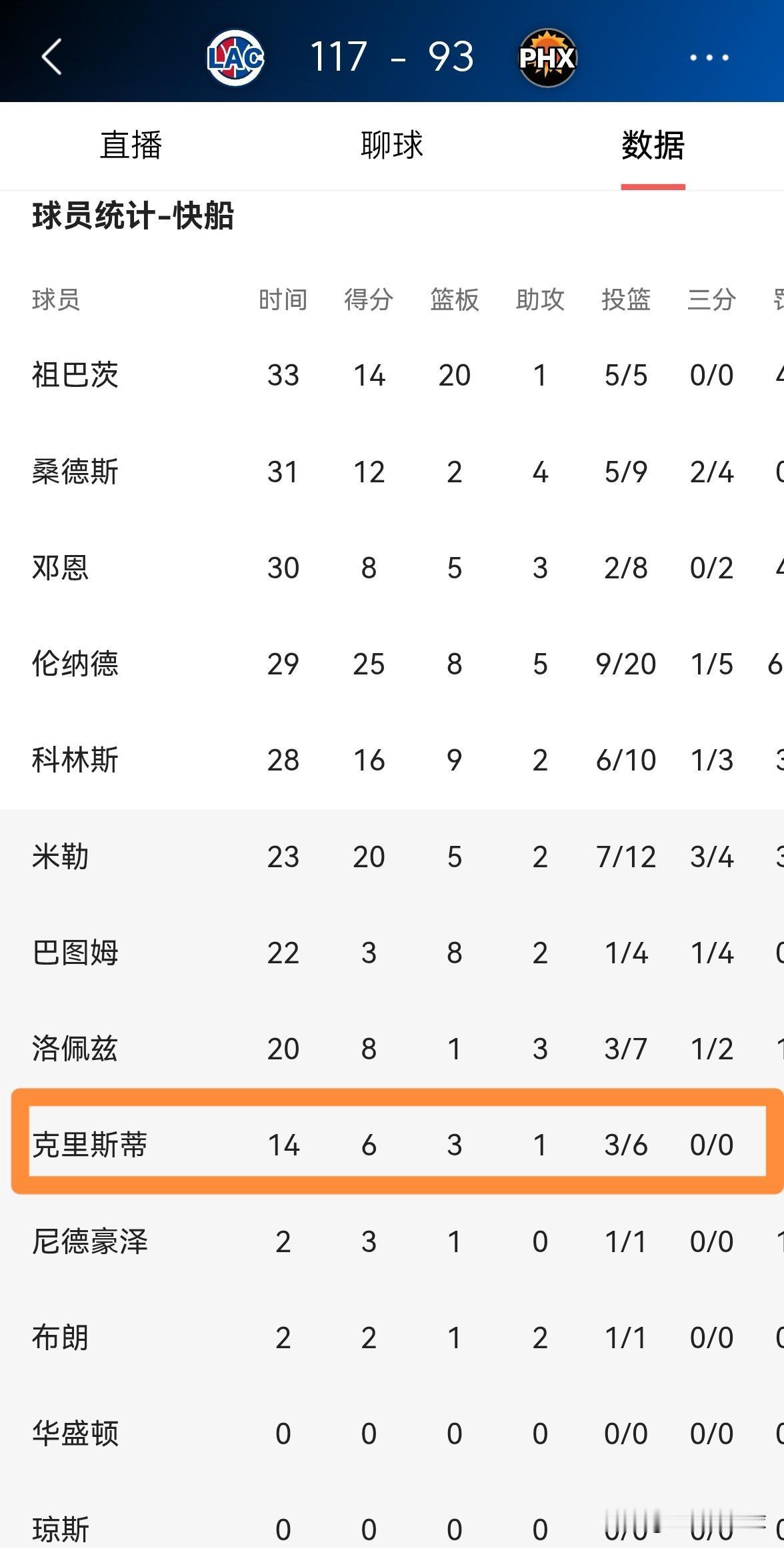 快船小将克里斯蒂真是不负众望!今天快船在客场以117:93击败太阳,取得了一场非常漂亮的大胜。本场比赛小将克里斯蒂替补登场14分钟,投篮6中3得到6分3篮板1助攻,他的场上正负值为全队最高的+25。 从克里斯蒂在本场比赛中的出色表现来看,他完全没有辜负主帅泰伦-卢的信任,他在攻防两端都为球队做出了非常大的贡献。