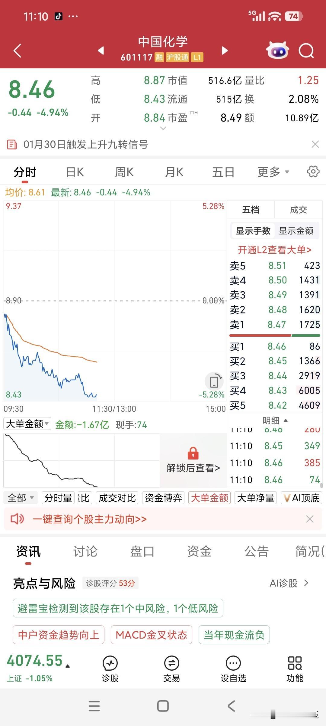 中国化学分红后大跌 本以为价值投资的股票下跌会缓和些,没想到上周持有的中国化学分红后,跌得那叫一个惨不忍睹。 中国化学上周五分红,这周一股价便如瀑布般狂泻。上午收盘时,它从低开的8.84元,一路跌到了8.40元,4毛4分转瞬即逝。 堂堂中字头绩优股,下跌时全然不顾企业形象。这让我不得不被动地从短线炒作转为长线价值投资。亏就亏了吧,这或许就是中国股民应有的觉悟。 中国中化 化学制药股票 化学原料板块 中国中化测评