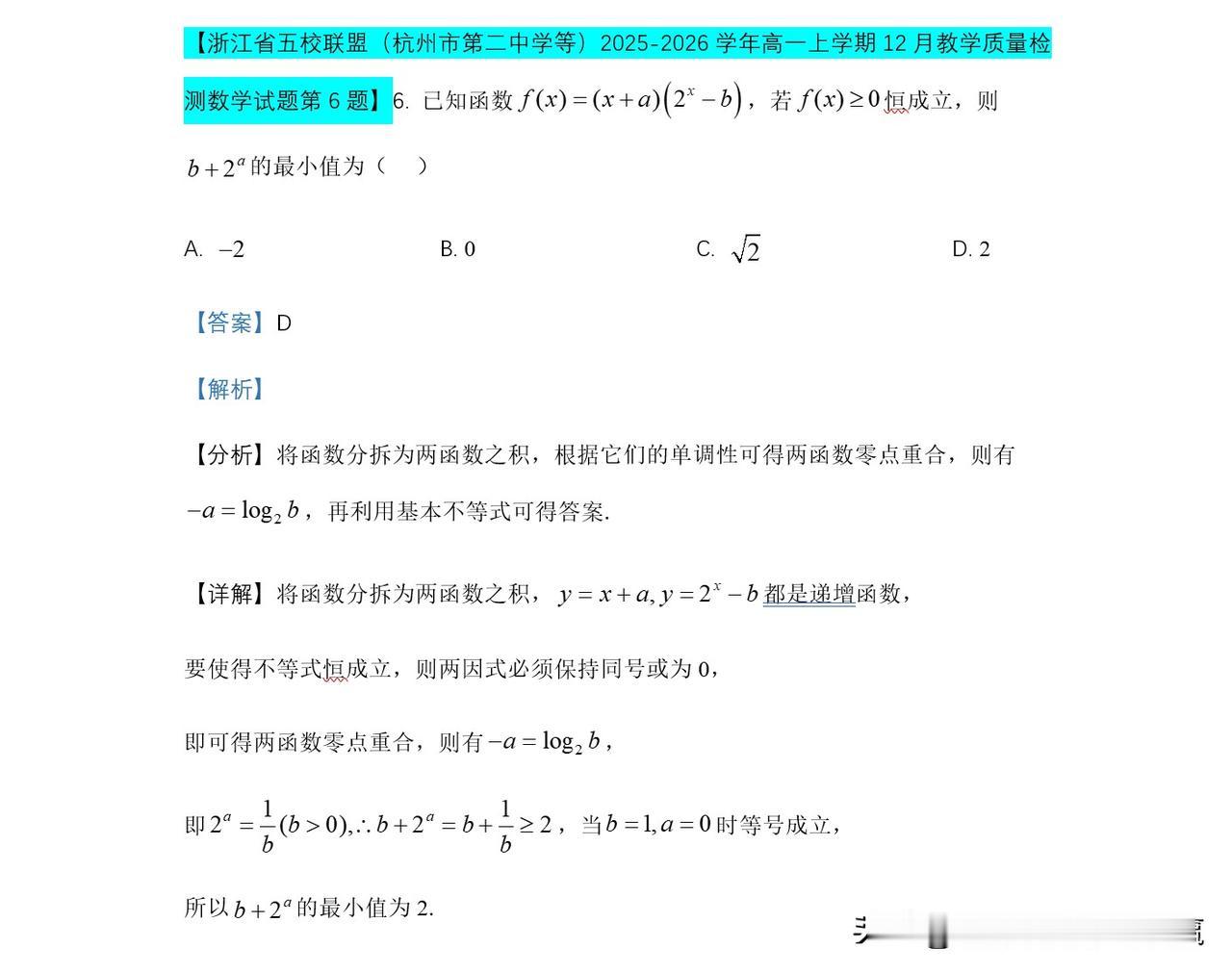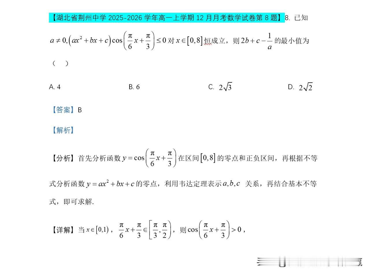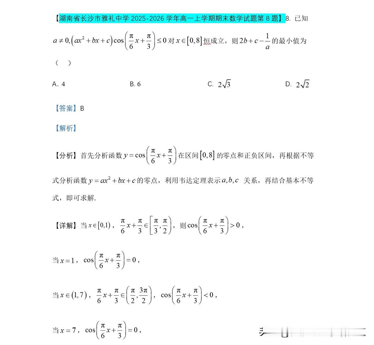 长沙雅礼高一期末试题第8题和前段时间分享的湖北荆州12月月考第8题重复。此类题主要考查同零点➕基本不等式求最值的方法,这类题看似难,其实比较简单。另外浙江五校联盟也是这类题。所以百强名校题相互参考和改编。 真正原创的题还是比较少的。