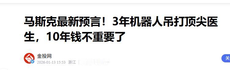 马斯克这哥们儿,终于说了句让我后背发凉的大实话。 这一次,马斯克不是高谈阔论火星移民,也不是给特斯拉粉儿打鸡血,而是在瑞士达沃斯的论坛现场,突然冷着脸甩出一句让全世界背脊一凉的大实话:人工智能用不了多久就要把人类的聪明劲儿全给比下去了,而且我们可能只是AI进化路上一个“生物引导程序”。 这种论断并非危言耸听。深度学习领域的领军人物杰弗里·辛顿曾精准测算过,目前人工智能处理复杂逻辑的能力,大约每7个月就能翻一倍。 这种进化速度,已经脱离了传统意义上的技术更迭。实际上,人类神经信号的传输速度极慢,每秒大约只有120米。而计算机使用的电流和光信号,每秒能跑30万公里。 这意味着,人类在大脑硬件上就比机器慢了数百万倍。过去,这种劣势被简陋的算法掩盖了,但随着全球算力以每年三倍的速度增长,硬件的鸿沟正在迅速变现。 很多顶尖工程师耗费大半辈子去攻克的数学难题或工程建模,现在的机器通过暴力搜索和概率重组,几乎可以在瞬间给出最优方案。 与之相伴的,是生产力结构的底层松动。马斯克正极力推进人形机器人项目,逻辑非常直白,既然一个不领薪水、不需要社保、能24小时盯着流水线的机器人成本已经降到了两万美元,那么传统的“以体力换资源”的生存模式就注定会失效。 然而,维持这种超级智能的代价也是惊人的。行业普遍预测,2030年将是一个严峻的转折点,爆发式的用电需求会直接考验现有的能源体系。 这也就是为什么硅谷巨头们现在纷纷扎堆投资核聚变,在未来的竞争中,谁能拥有更廉价、更高效的能源来喂养这些“数字大脑”,谁就掌握了绝对的控制权。 当然,这种变革虽然不可逆,倒也不必陷入盲目的恐慌。机器虽然擅长逻辑推演和路径优化,但目前它们依然无法生成真正的直觉,也无法复制人类特有的情感共鸣和复杂的价值判断。 市场的反馈已经说明了问题,目前那些能够熟练驾驭、调用AI工具的从业者,其薪资议价能力已经比同龄人高出了50%。 AI不是“会不会来”的问题,它已经深度介入了我们的生活。现在最紧迫的思考题是:一个智商足以碾压全人类总和的物种真正成熟时,作为它的“造物主”和“启动盘”,我们是学会了与它高效协作,还是在不知不觉中,已经变得无关紧要。 信息来源:《马斯克最新预言!3年机器人吊打顶尖医生,10年钱不重要了》,金投网,2026年1月13日。