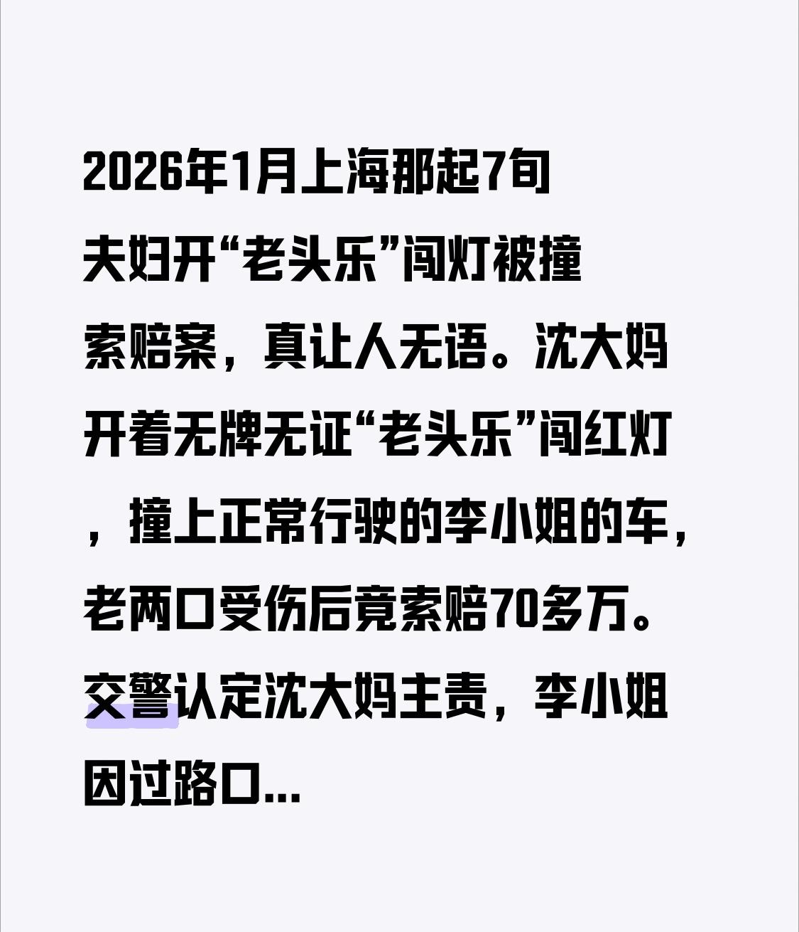 2026年1月上海那起7旬夫妇开“老头乐”闯灯被撞索赔案,真让人无语。沈大妈开着无牌无证“老头乐”闯红灯,撞上正常行驶的李小姐的车,老两口受伤后竟索赔70多万。交警认定沈大妈主责,李小姐因过路口没减速负次责,黄大爷没系安全带也担责。 法院审理驳回不合理诉求,按比例判保险公司赔36万,李小姐公司出6000元律师费,她自己不用掏钱。网友都说判得公道,老两口违规还狮子大开口太不讲理闯红灯撞死人