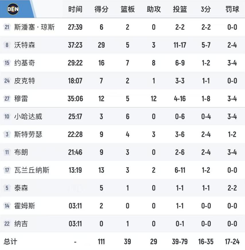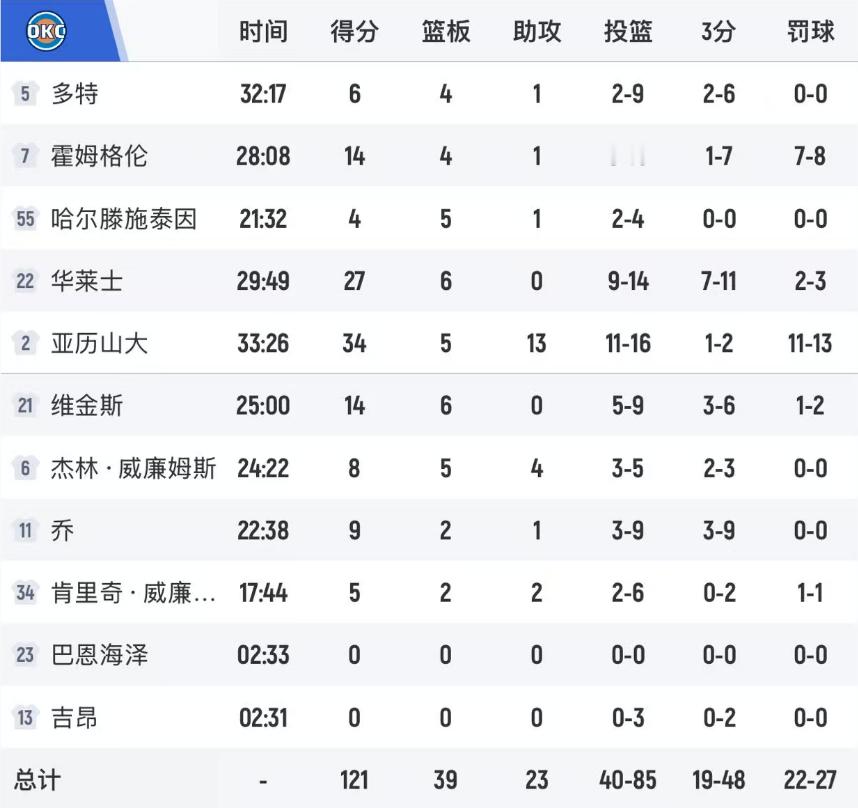 MVP级别对决,亚历山大34分13助攻5篮板3抢断,约基奇16分7篮板8助攻6失误,雷霆121-111拿下掘金。卡森·华莱士三分11中7得到27分,贾马尔·穆雷16中4,三分8中1,只得到12分12助攻。