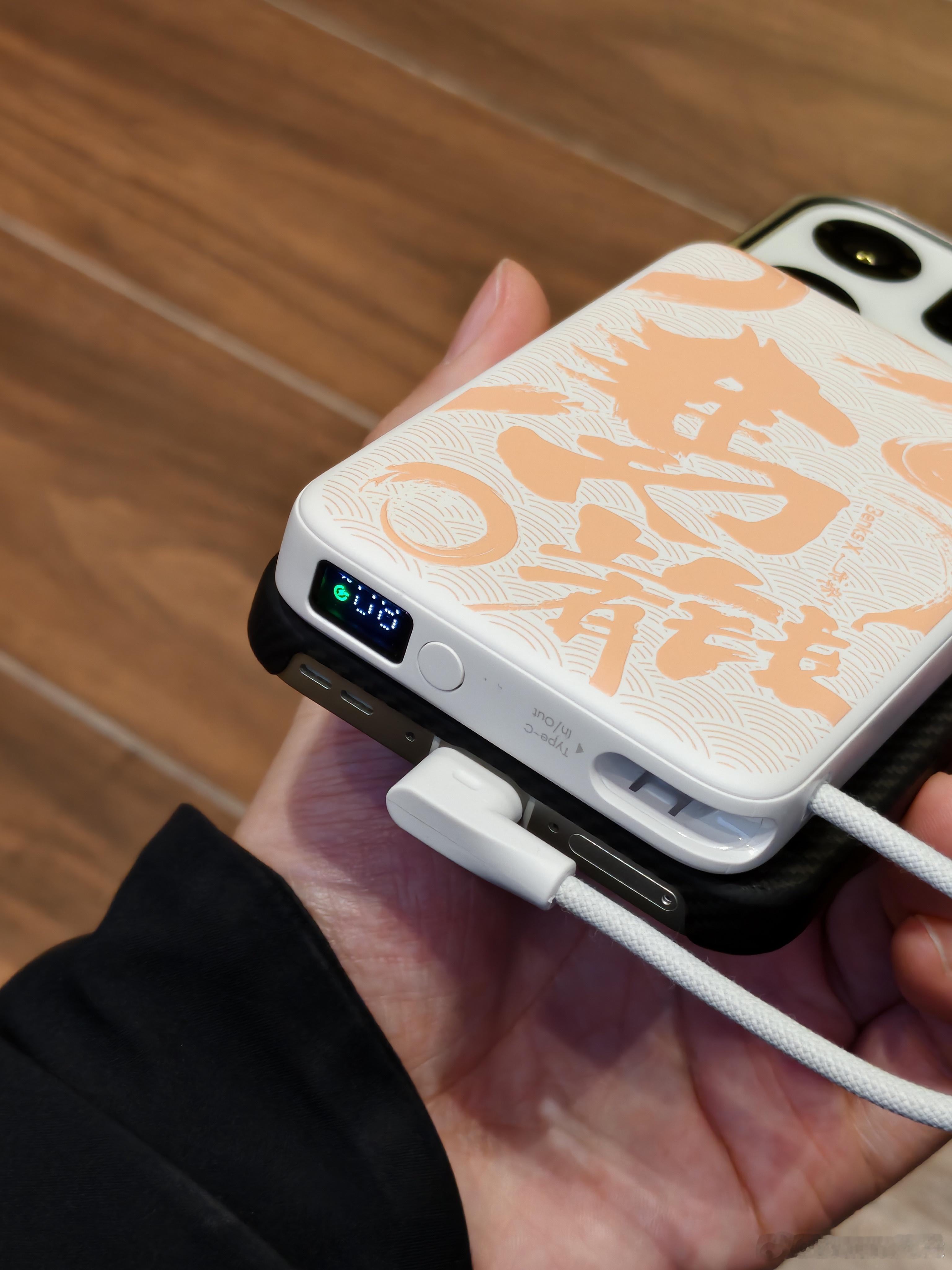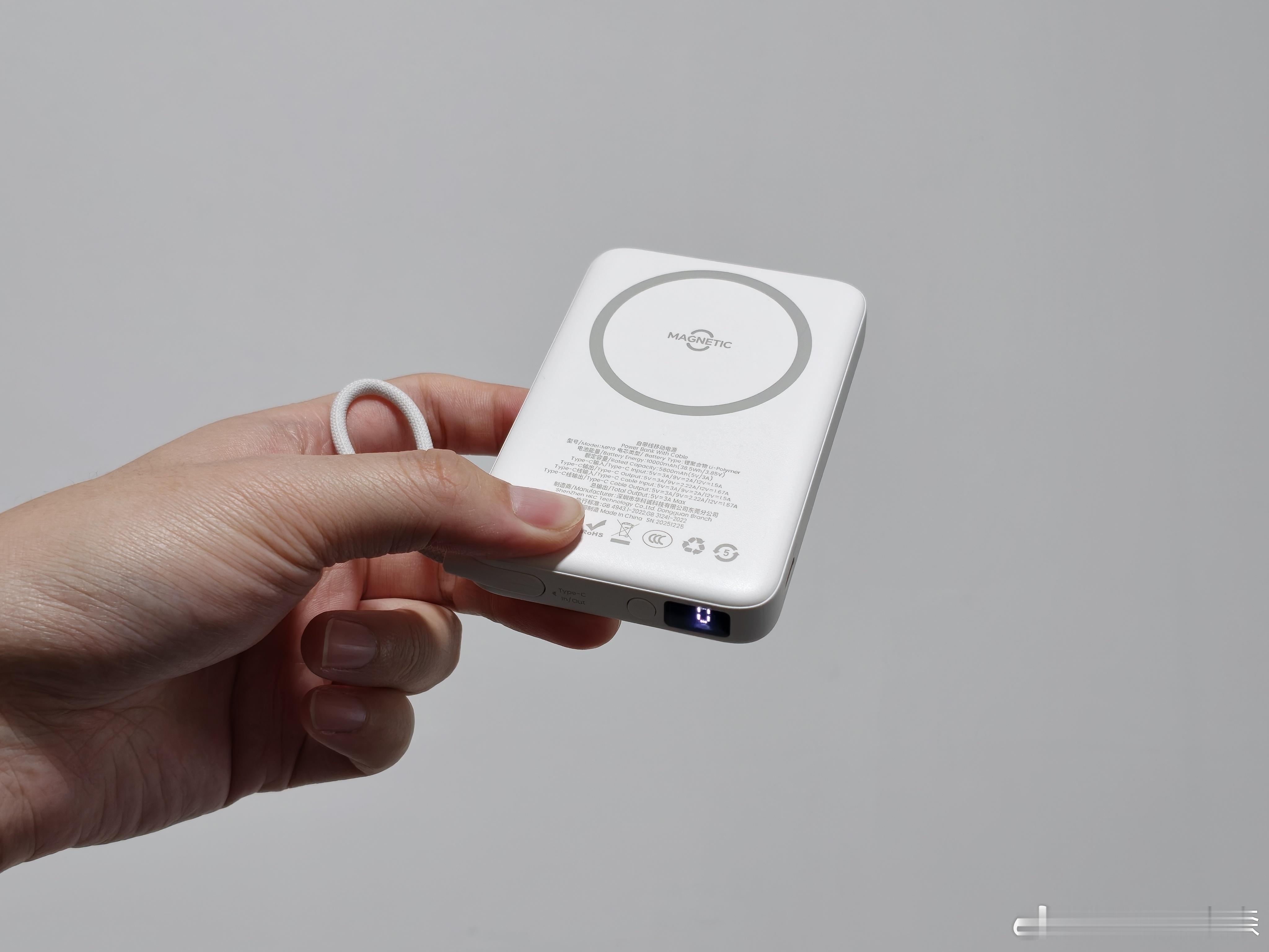 这个充电宝是我理想中的那种,它这个磁吸是纯磁吸,没有无线充电功能,自带一根线负责有线充电和提手功能。