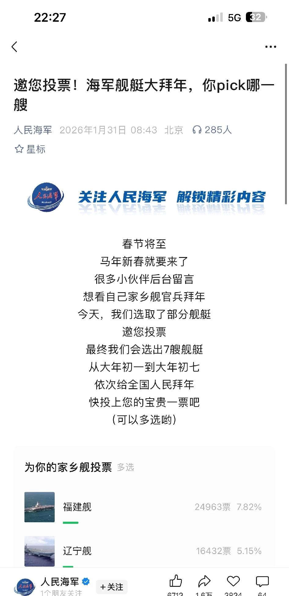 广西人怎么这么团结!!广西舰断层遥遥领先!! 海军搞了个投票,7艘舰艇按票从高到低依次从大年初一开始给全国人民拜年,广西人好团结啊,一举把广西舰投到了断层第一名!!! 我骄傲我自豪!!