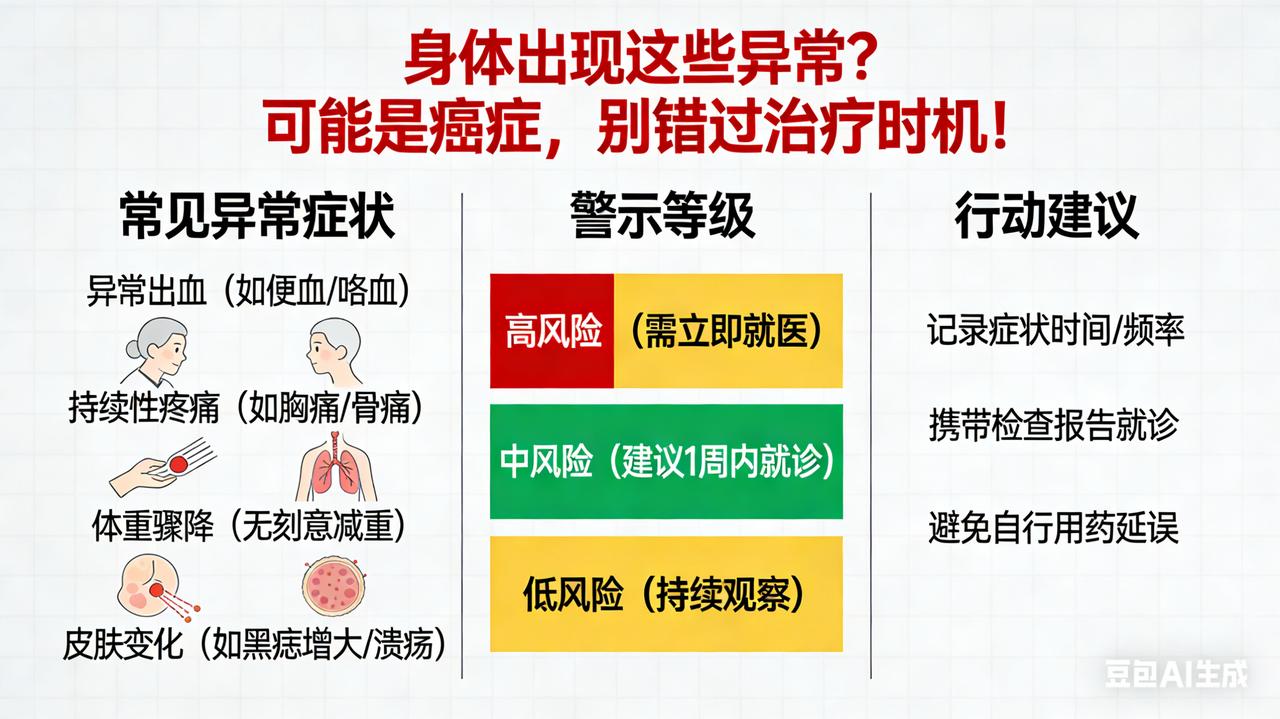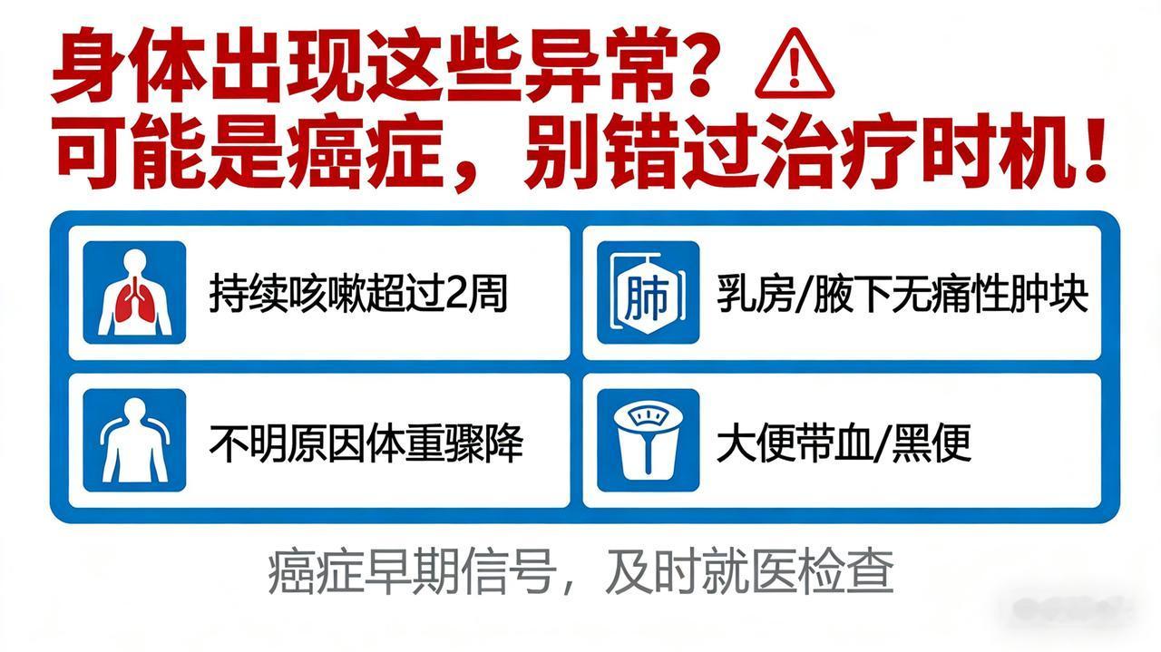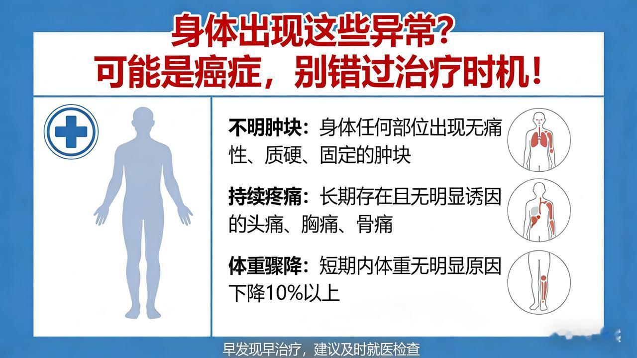 身体出现这些异常?可能是癌症,别错过治疗时机! 身体出现这些表现,很大可能指向癌症,务必尽早检查! 在生命的宏大叙事里,健康是最珍贵的篇章,而癌症,却如同隐藏在暗处的阴霾,悄无声息地侵蚀着这份珍贵,成为无数人闻之色变的“健康杀手”。其实,癌症并非完全无迹可寻,当身体出现以下这些异常表现时,就像拉响了紧急警报,是身体在向我们发出“求救信号”,此时务必尽早检查,为生命争取每一分每一秒的宝贵时机。 不明原因的体重骤降,宛如身体亮起的一盏刺眼红灯,是癌症发出的典型“预警”。想象一下,在没有任何节食计划,也没有刻意增加运动量的情况下,体重却在短时间内如断崖般大幅下降,比如一个月内莫名减轻超过10斤。这背后,是癌细胞在疯狂作祟,它们如同贪婪无度的“掠夺者”,肆意消耗身体大量的营养物质,无情地干扰机体正常的吸收和利用过程,使得身体如同失去养分供应的机器,逐渐“消瘦”下去。像胰腺癌、胃癌、肺癌等恶性肿瘤,早期常常会以这种令人担忧的症状悄然现身。 长期疲劳乏力,就像一层挥之不去的阴霾,笼罩着癌症患者的生活。普通的疲劳,如同短暂的风雨,经过适当的休息后往往能迅速消散;但癌症引发的疲劳感,却如影随形、顽固难消。这是因为癌细胞在生长繁殖的“征程”中,会释放出一些特殊的细胞因子,这些因子如同调皮的“捣蛋鬼”,扰乱身体正常的代谢和能量供应系统,让人感觉浑身软弱无力,仿佛被抽走了所有的精气神,精神萎靡不振。例如白血病、肠癌等患者,就常常被这种难以摆脱的疲劳感深深困扰。 身体出现异常肿块,恰似隐藏在身体里的“定时炸弹”,需要高度警惕。如果在颈部、腋窝、乳房、腹部等部位触摸到质地坚硬、边界模糊不清、活动度差的肿块,这很可能是癌症在早期埋下的“隐患”。比如乳腺癌常以乳房无痛性肿块为首发症状,悄然威胁着女性的健康;甲状腺癌则多在颈部出现逐渐增大的肿块,如同一个不速之客,打破身体的平衡。 此外,持续咳嗽、咯血可能是肺癌在“蠢蠢欲动”;大便习惯改变、便血可能与结直肠癌有着千丝万缕的联系;不明原因的发热,也可能是癌症引发身体免疫反应的“蛛丝马迹”。 癌症,早发现与早治疗的意义不言而喻,早期患者的生存率会如同坐上“上升电梯”般显著提高。所以,一旦身体出现上述异常,千万别抱有侥幸心理,应尽快前往医院进行全面细致的检查,做到早发现、早诊断、早治疗,为健康筑牢一道坚不可摧的防线,让生命之花继续绚烂绽放。