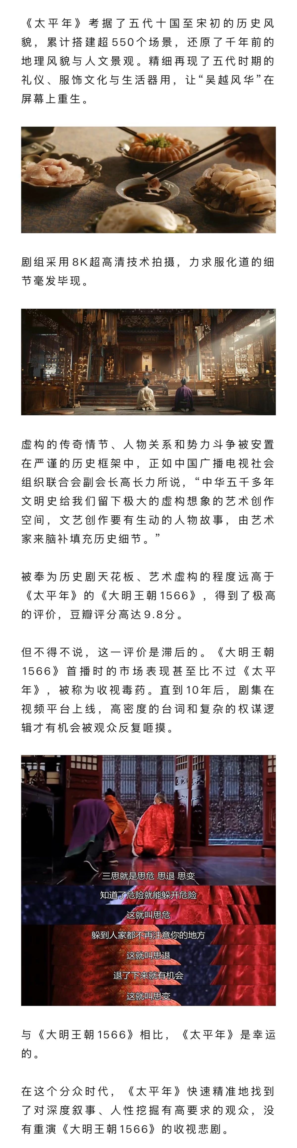 被太平年里的少年意气燃到历史正剧怎么拍才能让观众满意 跳出“权谋内卷”的窠臼,《太平年》把吴越国的乱世抉择拍得既有格局又有温度——不渲染杀伐,却聚焦“保境安民”的坚守,少年们的理想与老者的远见碰撞,8K镜头下的市井烟火与朝堂博弈相映,让冷门历史既有厚重感又有共情力。