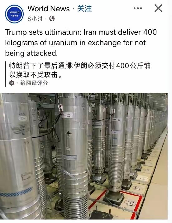 美国要求伊朗必须交出400公斤铀,以换取美国不打击伊朗!400公斤铀估计是一个伊朗无法交付的数字!也许伊朗国内根本没有这么多的铀! 美国只是给出了一个伊朗根本无法完成的任务!这就是“欲加之罪,何患无辞”!就知道你交不出来,所以美国要动手了。 即便是伊朗真的给美国交出去了400公斤铀,美国也会说,什么?你竟然真有400公斤铀,那就更有必要打你了!