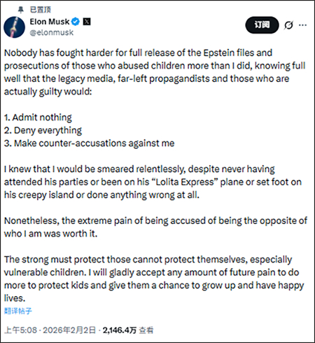 当地时间2月2日,马斯克在X平台上再次回应此事。他称,“没有人比我更努力推动全面公开爱泼斯坦案文件、并追究那些虐待儿童者的法律责任。我很清楚,这样做必然会招致传统媒体、极左翼宣传者以及那些真正有罪的人的反击。”