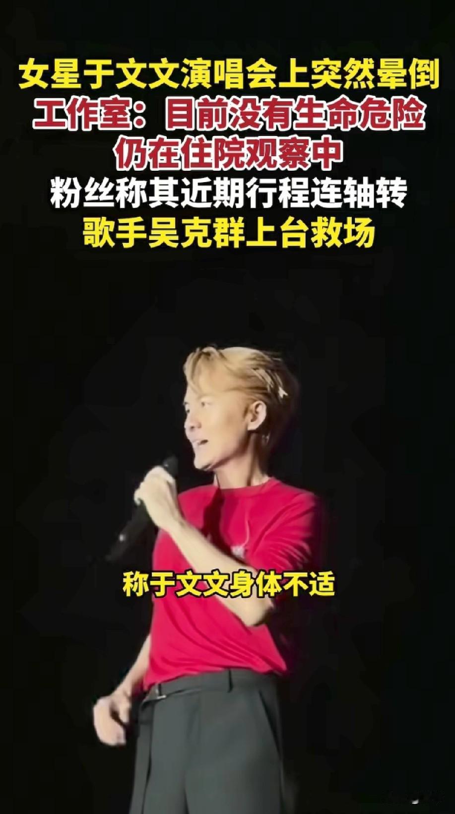 于文文演唱会晕倒登上热搜,恶心的一幕就发生了!有人说他挣钱挣的太欠了,还有人表示她太努力了! 2026年无限星空巨星演唱会,于文文在唱了几首歌之后,突然身体发抖,随后背着舞台蹲了下去! 现场几万人的观众目睹了这一切,并且有人拍到了这个画面,工作人员随后上前,然后余温直接倒地不起! 在她倒地之前,她的表情已经有些痛苦,看得出来那时候已经身体不适了,但是她还是坚持延长! 毕竟票都卖出去,这就是工作,她穿着比较单薄,当天温度比较低,嘴唇冻得发紫! 可能实在撑不住了,这才挡在了舞台上,随后工作人员拨打了120,她就当着粉丝的面被抬走了! 吴克群立马上台补救,给大家连忙道歉,并表示歌手之间就应该互相帮助,于文文接下来无法为大家演唱,那就让我来吧! 可以说吴克群这一上场,人品直接飞升,随后于文文在舞台上晕倒,直接登上热搜! 网友非常心疼,纷纷跑到她的社社交账号下,问她现在怎么样了?人应该没有什么大问题!可能就是太冷了! 这年头明星也这么拼,何况普通人呢,大家都是生活在一个物质超级发达的世世界,但是幸福感却一点点降低! 不过也有很多网友表达了不满,毕竟自己掏钱就是看于文演出的,吴克群顶上去,这算什么事儿? 大家对于于文文演唱会晕倒这事怎么看?不妨聊一聊! 于文文 于文文 演唱会 于文文 蹦迪