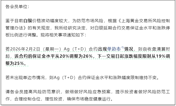 各会员单位:鉴于目前白银价格波动幅度较大,为防范市场风险,根据《上海黄金交易所风险控制管理办法》的有关规定,我所经研究决定,对白银延期合约交易保证金水平和涨跌停板比例进行调整。现将相关事项通知如下:若2026年2月2日(星期一)Ag(T+D)合约出现单边市情况,则自收盘清算时起,该合约的保证金水平从20%调整为26%,下一交易日起涨跌幅度限制从19%调整为25%。若未出现单边市情况,则Ag(T+D)合约保证金水平和涨跌幅度限制维持不变。请各会员提高风险防范意识,做细做好风险应急预案,提示投资者做好风险防范工作,合理控制仓位,理性投资,确保市场稳定健康运行。网页链接