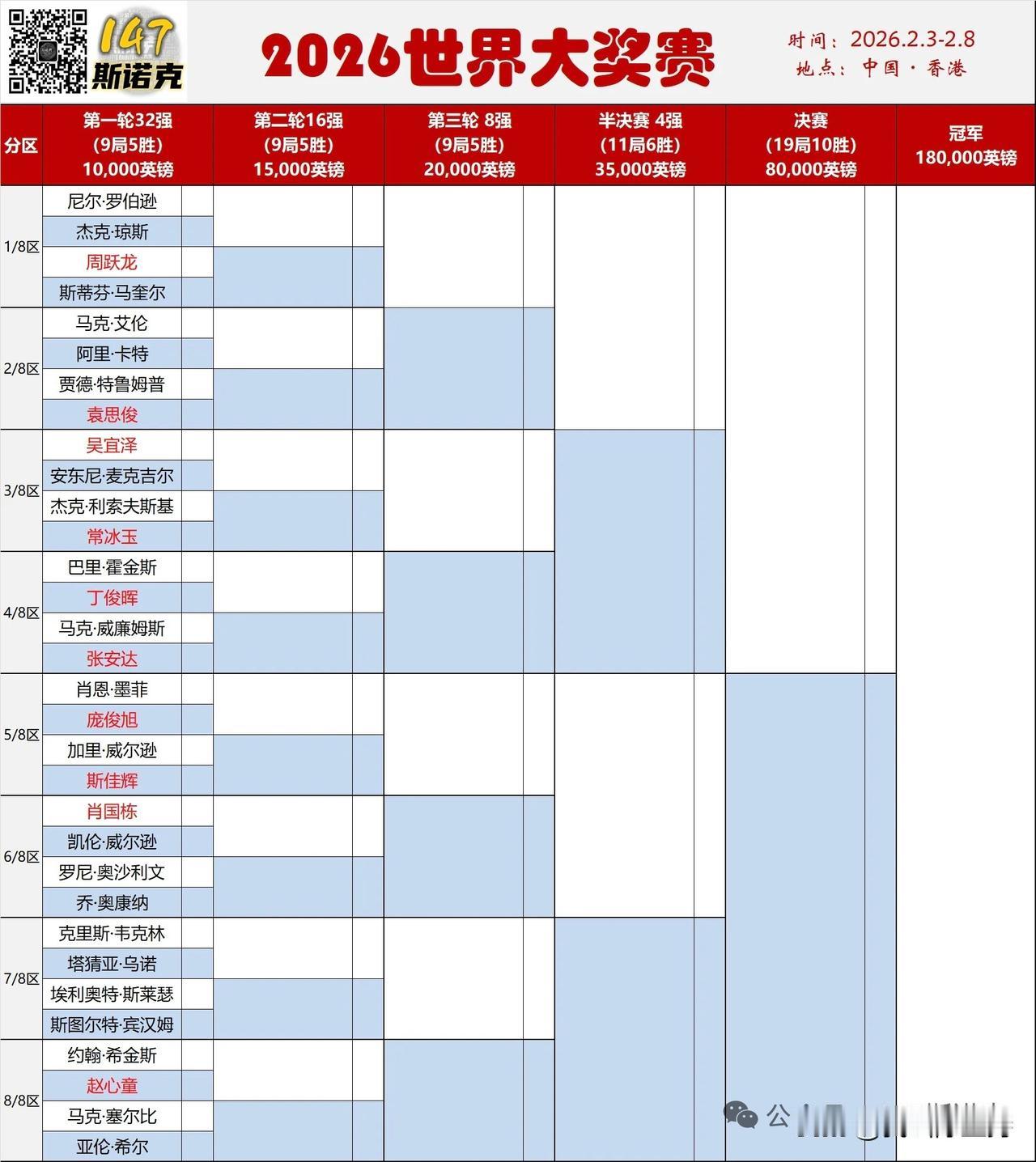 群星集结香港,世界大奖赛明日开杆。 世界大奖赛属于三大红包赛之一,只有单赛季前32才有资格参加,今年中国创纪录的有10名球员参赛。常冰玉压哨,获得苏格兰公开赛亚军进入。而且,这个比赛也是排名赛,奖金计入排名,冠军奖励高达18万英镑。 明日下午一点 肖国栋对阵凯伦威尔逊 周跃龙对阵马奎尔 晚上七点 丁俊晖对阵霍金斯 张安达对阵威廉姆斯 常冰玉对阵利索夫斯基 由于是赛季前32,状态都是最好的选手,必须值得一看。