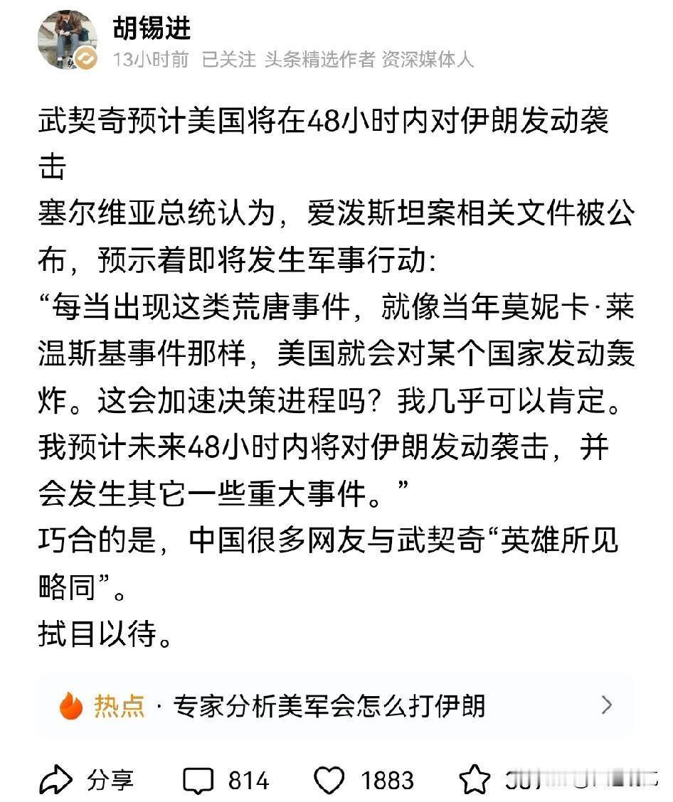 老胡发了这样一条消息,“武契奇预计美国将在48小时内对伊朗发动袭击”。 他给出的理由也很简单,就是因为爱泼斯坦丑闻的曝光,每当有这种荒唐的事情发生时,都会通过一场战争来转移注意力。 这确实是能够转移大家所关心的话题,对于这种级别的丑闻只能通过更大更炸裂的事件来夺人眼球。 而且看到老胡的字里行间,也是对这种预测持相同的观点,大家怎么认为呢?