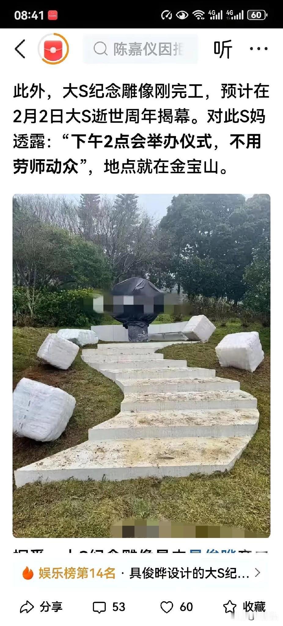 2月2日上午,大S在金宝山的未揭幕的雕像已换成粉红色盖头了,此前是黑色塑料布的。 换上粉红色盖头后,远看似仙女,很养眼,雕像前面9级台阶和旁边的艺术石块,也都擦得干干净净,为下午2点大S雕像揭幕典礼做了完美的准备工作。 这些工作估计都是具俊晔做的,因为大S去世一年来,整个S家族中,只有他总是一个人在金宝山操心大S的事,独自默默的上坟陪伴及设计雕像,悲伤得又黑又瘦。 2月2日,是大S去世一周年,具俊晔用雕像揭幕来纪念她,确实很用心。 对此,有网友认为具俊晔对大S是真爱,生死相依,也有网友认为他是太内疚,因为大S只是因小小的感冒而丧命,作为丈夫,他没及时送医,备受争议。 不过,不管怎么说,大S死后他所做的一切,也算是有良心之人。