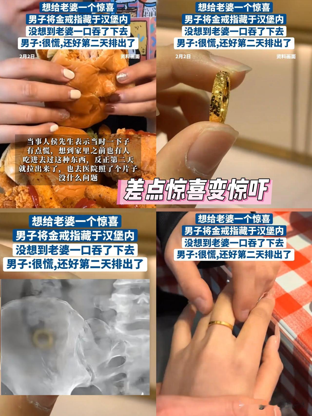 男子本来想给老婆惊喜,结果汉堡里的金戒指被一口吞了! 湖北一男子想给老婆制造浪漫惊喜,把金戒指偷偷藏进汉堡里,结果老婆饿急了一口闷,连戒指带汉堡直接下肚! 男子当时就慌了:完了完了,这可不是小珠子,是好几万的金戒指啊! 好在他心理素质还行,想起家里有人以前也误吞过东西,第二天就拉出来了,赶紧带老婆去医院拍了片,确认戒指在肠胃里“一路通畅”,没卡住也没刮伤,虚惊一场。差点惊喜变惊吓[捂脸] 浪漫有风险,藏戒需谨慎! 万一卡住可不是开玩笑的,真吞了赶紧去医院,别赌“肠道自助游”! 你们还见过哪些离谱的“惊喜变惊吓”?评论区说说你们的离谱经历!