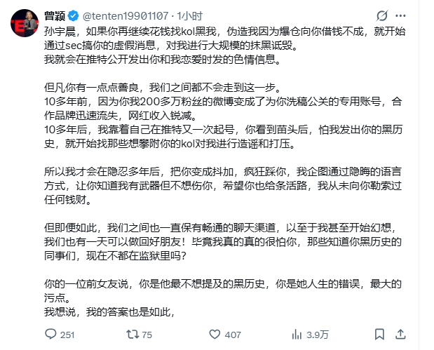 孙宇晨,如果你再继续花钱找kol黑我,伪造我因为爆仓向你借钱不成,就开始通过sec搞你的虚假消息,对我进行大规模的抹黑诋毁。我就会在推特公开发出你和我恋爱时发的色情信息。说实话,我好想看一看孙割的色情信息