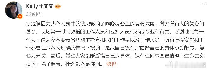 于文文回应演唱会晕倒于文文发文回应 2月2日,发文回应在演唱会晕倒,她感谢大家的关心,称工作人员和医护人员都很专业,希望大家不要责备活动主办方和工作人员:“是我自己没有评估好自己的身体承受能力,与他人无关。”她也希望大家都能爱惜身体。