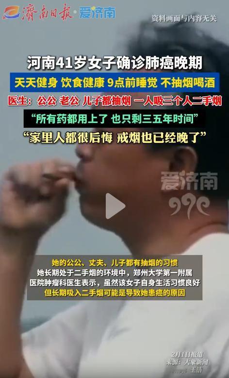 悲剧还是发生了!河南41岁女子确诊肺癌晚期,可她天天健身饮食健康,9点前睡觉,也从来不抽烟喝酒,现在所有药都用上了也只剩三五年时间,原因竟然是她的公公,老公,儿子都抽烟,相当于一人吸三个人二手烟! 谁能想到,一个把养生刻进骨子里的人,居然没能躲过肺癌的魔爪。河南一位41岁女子,作息规律、饮食健康,从不抽烟喝酒,却被确诊肺癌晚期,医生的一句话,让全家陷入无尽悔恨,再怎么补救都晚了。 这位41岁的女子,生活习惯好到让人佩服。多年来,她坚持每天健身,不管工作多忙都不会间断,饮食上也格外讲究,清淡少油、荤素搭配,从不吃垃圾食品,更没有抽烟喝酒的恶习,每天晚上9点前准时睡觉,连熬夜都极少有,妥妥的“养生标杆”。 可就在前段时间,她频繁出现胸闷、咳嗽的症状,一开始以为是换季感冒,没太在意,只拿了点感冒药服用。 可症状持续了半个多月,不仅没有好转,反而越来越严重,有时候咳嗽到睡不着觉,甚至会咳出血丝,这才让她和家人慌了神。 家人赶紧带她前往郑州大学第一附属医院检查,一系列排查后,最终的诊断结果如同晴天霹雳——肺癌晚期。 拿到报告单的那一刻,全家都不敢相信,明明生活习惯这么好,怎么会患上如此重病,而且一发现就是晚期。 肿瘤科医生详细询问了她的生活环境和家人的生活习惯后,给出了关键结论:虽然女子自身没有吸烟史,生活习惯也极佳, 但长期处于二手烟环境中,大概率是诱发肺癌的主要原因。原来,她的公公、丈夫和儿子都有抽烟的习惯,家里几乎常年被烟雾笼罩。 医生进一步解释,二手烟中含有至少250种有毒有害成分,其中69种是明确的致癌物,任何通风设备都无法彻底清除室内的二手烟, 而且二手烟中的60%~80%致癌物会附着在物体表面,形成三手烟持续危害健康。对女性而言,呼吸系统更敏感,长期暴露在二手烟中,患肺癌的风险会大幅提升。 更让人揪心的是,医生坦言,目前所有能用的药物都已经给女子用上了,但病情已经发展到晚期,最多只剩下三五年的时间。 这个消息像一块巨石,压得全家人喘不过气,公公、丈夫和儿子更是追悔莫及,当即下定决心戒烟,可一切都已经晚了。 据了解,我国有超过3亿吸烟者,约7.4亿不吸烟者遭受二手烟暴露的危害,很多人误以为自己不抽烟就不会得肺癌,却忽略了二手烟的隐形杀伤力。哪怕每天仅吸入少量二手烟,长期下来也相当于轻度主动吸烟,会显著增加患癌风险。 女子的家人坦言,以前从没想过二手烟的危害这么大,在家抽烟时从不会刻意回避,总觉得开窗通风就没事,如今因为自己的习惯,毁掉了家人的健康,这份悔恨这辈子都无法弥补。 女子的遭遇也提醒着所有人,二手烟从不是小事,家人的健康,从来都藏在每一个细节里。对此,你们有什么看法,欢迎评论留言~