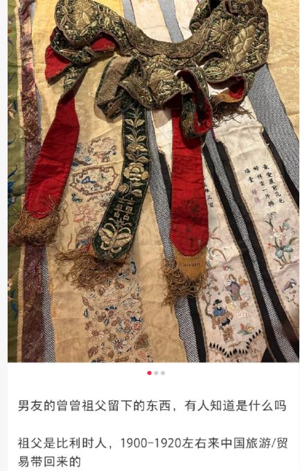 我刷到一个在比利时的留学生,发帖说她自己在比利时的男友,男友的曾曾祖父留下了一个收藏品。 有眼尖的网友立刻发现,这个是清朝的婚服上的一些配饰,白色的是刺绣,挽袖绣的内容是: 笑他英雄三百辈,一起随我步沧州。最爱篱前花色好,祥云一片拥瑶台。 这件衣服绝对是当时有钱人家的出嫁的装扮。 但是,偏偏这件衣服上沾染了很多这种喷溅式的血迹,一看就是在新婚当天被屠门了。 但凡你受过中国的九年义务教育,你有一点教育水平,你就肯定会知道那段时间,1900年到1920年,中国发生了什么历史。 课本上的八国联军侵华战争,你难道就没有考过吗?没有学过吗? 如果这对新人活到新中国解放,也不过才六七十岁啊。 我真的不敢想象,这件婚服,或许是从死去的新娘身上拔下来的。