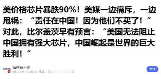 美芯片价格暴跌90%!美媒直接破防:“责任在中国,因为中国不买了!”曾经90美元的芯片如今只卖10美元,对此,比尔·盖茨早已警告:“中国会在短时间找到有效的解决办法,美国给自己树立了一个可怕的强敌!”现在一语成谶! 这些年美国一直怕中国科技起来,尤其是半导体领域,总想用封锁的办法卡我们脖子。 从2018年开始,就针对华为等中国企业下禁令,不让卖先进芯片给我们;2022年又升级管制,连英伟达那些高端AI芯片都不准出口到中国,还联合荷兰阿斯麦等企业,停供我们需要的芯片制造设备,想着把中国芯片产业锁死在低端,永远依赖他们的产品。 美国当时打得算盘很精,觉得只要把技术和设备一断,中国就搞不出自己的芯片,只能乖乖等着求他们。 可他们万万没算到,中国人最不怕的就是被卡脖子。你越不让我们用,我们就越要自己搞。这些年,中国不管是政府还是企业,都砸了大量资金在芯片研发上,科研人员没日没夜攻关,一步步补齐产业链的短板。 早在2023年3月,比尔·盖茨在接受采访时就看透了这一点,他直接警告美国,这种封锁政策根本没用,只会逼着中国投入更多时间和资金造自己的芯片,最后美国只会给自己树立一个可怕的强敌。 盖茨还拿历史举例,说以前对付对手都是关键时候才禁运,现在早早亮底牌,就是帮中国提前备战。可当时美国决策层根本听不进去,反而变本加厉加码制裁,2024年还把36家中国企业列入黑名单,连英伟达的H20芯片也禁售,把路彻底堵死。 结果就是,盖茨的警告很快应验了。中国芯片产业不仅没被打垮,反而越挫越勇。华为早在2023年就推出了全本土制造的麒麟9000S芯片,性能一点不比国外同类产品差,之后又迭代到麒麟9030,稳稳撑起了自家手机和设备的需求。 中芯国际也不断突破,把成熟制程的芯片产能拉满,2024年月产能达到80万片以上,全球每新增四成成熟制程芯片产能,就有中国的贡献。 还有长江存储,自主研发出3D NAND闪存芯片,打破了三星、美光等海外企业的垄断,2025年第三季度全球出货份额已经达到13%,和美光持平,跻身全球第四。 中微公司、南大光电等企业也在芯片设备和材料上实现突破,刻蚀机、光刻胶这些曾经的卡脖子产品,现在都有了国产替代。到2025年,中国芯片自给率已经接近70%,普通常用的芯片基本能自己满足,自然就不用再大量买美国的了。 中国这个全球最大的芯片市场不再依赖美国产品,美国芯片企业立马就慌了。以前中国市场能贡献美国半导体企业一半以上的收入,是他们的“摇钱树”,现在这块市场没了,芯片就大量积压在仓库里。 英伟达就是最典型的例子,它的先进AI芯片对中国市场的份额从95%直接跌到0%,2025年1月股价一下跌了17%,市值蒸发了5930亿美元,之后只能靠降价清货,把原本90美元的芯片降到10美元甩卖,跌幅正好九成。 除了英伟达,其他美国芯片企业日子也不好过。DRAM和NAND闪存芯片因为库存太多,2024到2025年价格一路下跌,仅2025年第一季度就跌了8%到13%,其中DDR4型号跌得最厉害。 美国企业想开拓其他市场填补缺口,可中国市场的体量太大,亚洲其他地区的需求根本补不上,最后只能被动降价,利润大幅缩水。 美媒现在甩锅中国不买,完全是颠倒黑白。不是我们故意不买,是美国先用禁令把我们拒之门外,逼着我们搞自主研发。等我们自己能造了,不再需要他们的产品了,他们又反过来怪我们,这道理根本说不通。 美国的问题,本质上是自己的战略失误,他们以为靠封锁就能遏制中国,却忘了中国人自力更生的能力,反而激发了我们的研发动力。 更讽刺的是,美国越是制裁,中国芯片产业发展越快。从2022年到2024年,中国大陆一下子冒出了3451家芯片设计公司,比除中国外全球其他同类公司的总和还多十几倍。 这些企业在成熟制程领域深耕,不断提升产能、优化价格,把曾经被美国企业垄断的电源管理芯片、车规级芯片等市场一个个攻破,让美国芯片彻底失去了竞争优势。 盖茨后来在2025年5月的访谈中再次重申,美国的技术禁令完全适得其反,反而推动中国全速前进,现在中国在芯片领域的进展远超预期。 他还批评美国的关税政策,说这等于明确告诉中国“去自己造芯片吧”,最后美国企业损失惨重,对华为的销售就减少了330亿美元,反而让中国企业更加强韧。 现在的局面很清楚,美国芯片价格暴跌九成,是自己搬起石头砸自己的脚。当初听不进盖茨的警告,一门心思搞封锁打压,结果不仅没拦住中国,还把自己的芯片市场搞垮了。中国从来不想和谁对抗,可面对打压,我们有能力找出解决办法。