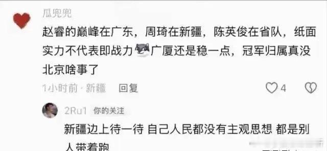 还有新疆的网友写道:赵睿的巅峰在广东,周琦在新疆,陈英俊在省队,纸面实力不代表即战力,广厦还是稳一点,冠军归属真没北京啥事了。”赵睿回复道:“新疆边上待一待,自己人民都没有主观思想,都是别人带着跑。”