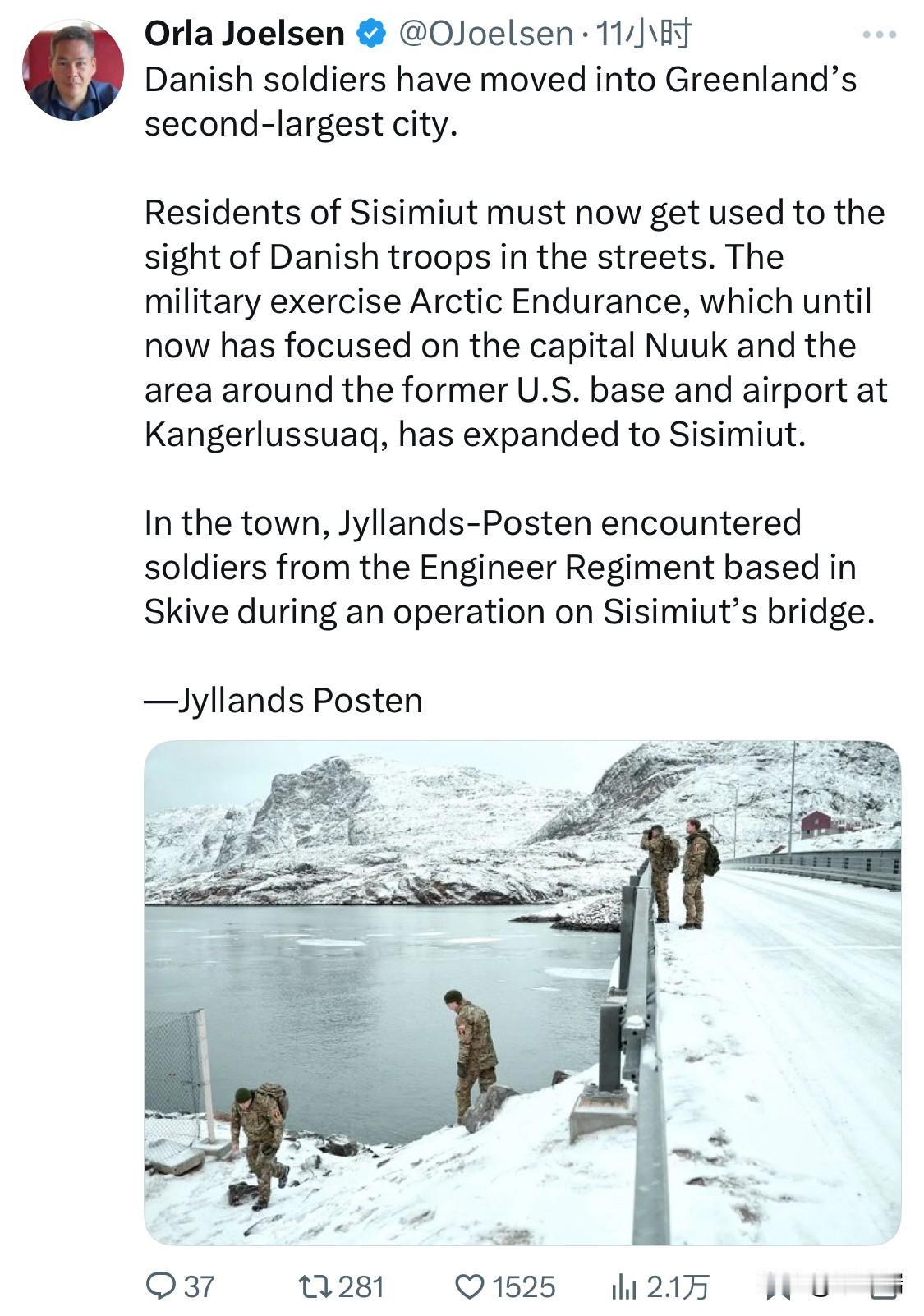 据来自《日德兰邮报》的消息,丹麦士兵已进驻格陵兰岛第二大城市。 西西米尤特的居民现在必须习惯在街上看到丹麦军队的身影。此前主要集中在首都努克和康克鲁斯瓦格前美军基地及机场周边地区的“北极耐力”军事演习,如今已扩展至西西米尤特。 在镇上,《日德兰邮报》记者遇到了驻扎在斯基沃的工兵团的士兵,当时他们正在西西米乌特桥上执行任务。