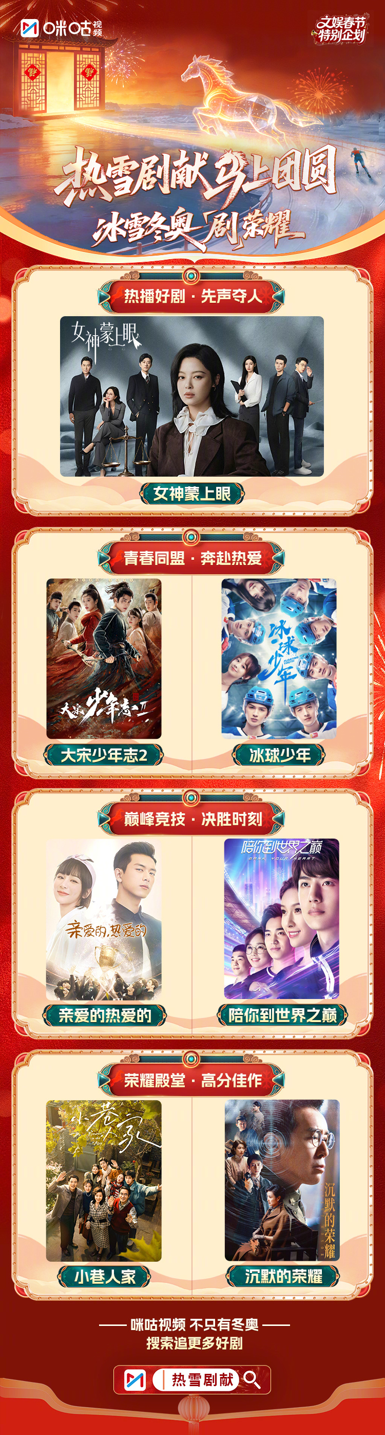 #热雪剧献马上团圆##咪咕视频不只有冬奥#这个冬天,上看冬奥追好剧,一键Get双倍热血❄️🔥▪️ 热播好剧:《女神蒙上眼》青春同盟:《大宋少年志2》;《冰球少年》▪️ 巅峰竞技:《亲爱的,热爱的》▪️ 高分佳作:《小巷人家》豆瓣8.4分 ;《沉默的荣耀》豆瓣8.0分 点击直达专题,解锁你的专属冬奥片单:网页链接🎁 惊喜福利:即日起,关注,同时带话题#热雪剧献马上团圆#并抽奖详情