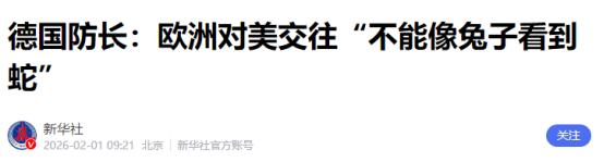 “出头鸟”来了! 德国突然宣布:2月1日,德国国防部长皮斯托里乌斯公开宣布:面对特朗普在格陵兰岛问题上的不可预测性,欧洲各国交往美国时“不能像兔子看到蛇一样”,必须保持自信,不能被吓倒。 这事的根源,全在特朗普和格陵兰岛那点纠葛上。今年1月初,特朗普就突然放话,要对格陵兰岛“采取行动”,不管当地和丹麦同不同意,甚至放狠话要是走不通捷径就来硬的。 格陵兰岛是丹麦的领地,特朗普这说法,就是明着想插手甚至掌控这块地方。可没几天,他在达沃斯论坛上又改口,说不会用武力夺取格陵兰岛,还暂时取消了对欧洲八国的贸易战威胁。 特朗普这种说变就变的脾气,把欧洲各国坑得够呛。大家都摸不准他下一步要干什么,心里又怕又烦。 要知道,格陵兰岛不只是一块普通的土地,它守着北极航道的关键位置,军事和战略价值极高,美国早就对它垂涎三尺,几十年前就想从丹麦手里买下来,只是一直没成。现在特朗普又来这一出,欧洲各国清楚,这不是简单的领土争端,是美国想进一步控制欧洲的安全命脉。 以前欧洲各国对美国,大多是听招呼、顺着来。毕竟二战后,欧洲的防务主要靠美国撑着,有美国的核保护伞照着,很多国家都不敢轻易得罪美国。 可这次特朗普在格陵兰岛问题上的胡来,再加上之前在贸易、防务上的反复拿捏,彻底让欧洲忍不下去了。德国这次站出来当“出头鸟”,不是一时冲动,是欧洲对美国长期不满的一次爆发。 皮斯托里乌斯在表态里说得很明白,欧洲不能再一门心思盯着美国的一举一动,更不能被美国的反复无常吓住,得把精力放在增强自己的实力上,搞自己的主权和防御能力。 这话不是空话,现在欧洲已经在慢慢行动了。之前欧盟就讨论过要建自己的防御体系,法国总统马克龙也说,欧洲要搞自己的预警系统和打击能力,不能再完全依赖美国。 而且德国的表态,也不是孤军奋战,欧洲不少国家都跟着呼应。丹麦首相早就明确说,格陵兰岛不会被美国控制,要是美国敢对北约盟友动武,那整个北约和现有的安全体系就全完了。 欧盟外交代表也公开表示,美国还是盟友,但双方的关系已经不如以前了。瑞典、比利时等国的领导人也纷纷表态,反对美国的强权做法,说不能再对美国逆来顺受。 其实欧洲心里早就清楚,美国靠不住了。特朗普在达沃斯论坛上的演讲,把欧洲盟友骂了一顿,说所有人都在占美国的便宜,还炫耀自己随便就提高对瑞士的关税,又因为企业游说就降低税率。 这种把外交当生意做、完全不讲规则的做法,让欧洲政要们彻底寒了心。大家都看明白,美国只会优先考虑自己的利益,根本不会顾及盟友的感受,跟着美国走,只会越来越被动。 当然,欧洲也不会一下子和美国闹掰。皮斯托里乌斯也承认,美欧还是相互需要的,美国需要欧洲当战略伙伴,欧洲也还需要美国的核保护伞,要是欧洲被俄罗斯的势力范围覆盖,也不符合美国的利益。 双方就像有共同利益的伙伴,只是以前欧洲一味妥协,现在终于敢挺直腰板说话了。这种变化,不是要决裂,而是欧洲要争取和美国平等对话的地位,不再做只能听话的小弟。 美国现在也该醒醒了,别再把欧洲当成可以随便拿捏的软柿子。以前美国仗着欧洲依赖自己,在贸易、防务上想怎么来就怎么来,可现在欧洲已经开始抱团搞自主,德国带头硬气之后,肯定会有更多欧洲国家跟着站出来。 特朗普的不可预测性,不仅没吓到欧洲,反而倒逼欧洲团结起来,加快搞自己的防务和主权。 接下来大家就能看到,欧洲会在防务上投入更多精力,逐步减少对美国的依赖,和美国打交道时也会更有底气,不会再美国说什么就是什么。美国要是还想用以前的老办法控制欧洲,恐怕只会碰一鼻子灰。 德国这只“出头鸟”,不仅打破了欧洲对美国的畏惧心理,更让美欧之间的关系发生了实实在在的变化。往后的跨大西洋伙伴关系,不会再是美国单方面说了算,欧洲要拿回属于自己的话语权了。 说到底,国家之间的交往,还是靠实力说话。欧洲以前软,是因为自己的防务和实力不够,只能靠美国。现在欧洲慢慢强大起来,自然就不会再惯着美国的坏脾气。 德国带头表态,就是给欧洲各国传递一个信号:和美国打交道,自信才是硬道理,不用怕,也不能怕。这种变化,会影响整个欧美关系的走向,也会让全球的格局跟着发生改变。