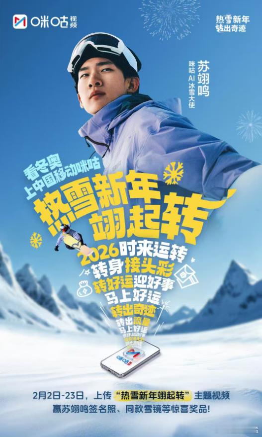 2月2日到2月23日,带上话题词热雪新年翊起转看冬奥上咪咕 发布微博,上传“热雪新年翊起转”主题视频,赢苏翊鸣签名照、同款雪镜等惊喜奖品!