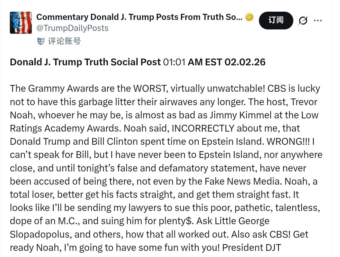 美国东部时间凌晨1:01 2026年2月2日特朗普发文: 格莱美颁奖典礼简直糟透了,根本没法看!CBS真是走运,终于摆脱了这种垃圾节目。主持人特雷弗·诺亚(Trevor Noah),不管他是谁,都跟吉米·坎摩尔(Jimmy Kimmel)在收视率低迷的奥斯卡颁奖典礼上的表现差不多。诺亚竟然错误地声称唐纳德·特朗普和比尔·克林顿去过爱泼斯坦岛。大错特错!!!我不能代表比尔发言,但我从未去过爱泼斯坦岛,甚至连附近都没去过。而且,直到今晚他发表这番虚假诽谤言论之前,我从未被任何人指控去过那里,就连那些假新闻媒体也没这么说过。诺亚,这个彻头彻尾的失败者,最好赶紧把事实搞清楚。看来我要派律师去起诉这个可怜的、可悲的、毫无才华的、愚蠢的MC,让他赔偿一大笔钱。去问问小乔治·斯洛帕多波勒斯(Little George Slopadopolus)和其他人,看看结果如何。也去问问CBS吧!诺亚,准备好了吗?我要好好“招待”你!——特朗普总统
