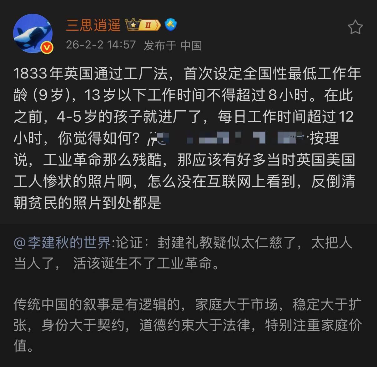 🔻不知道打码这个人在说什么。🔻工业革命早期(1760–1840年左右)摄影技术尚未普及(摄影约1839年后才出现),因此真正“当时”的照片非常稀少,大多是维多利亚时代晚期(19世纪中后期至1900年前后)的照片,或是描绘工厂/矿井童工的早期摄影/版画。照片当然有,许多流传最广的真实照片来自美国刘易斯·威克斯·海恩(1908–1924年)拍摄的童工系列。🔻图2:1909 年,佐治亚州梅肯市,小男孩们在一家纺纱厂劳作。这些孩子身材瘦小,以至于不得不爬上机器才能完成工作。工业革命时期,年幼的孩童常常在危险的工厂岗位上长时间工作,却只能获得微薄的报酬。🔻图3:1909 年 1 月,佐治亚州奥古斯塔市环球棉纺厂里的小纱线工。监工称她是正式雇佣的工人。地点:佐治亚州奥古斯塔。摄影师:刘易斯·威克斯·海恩。🔻图4:1911 年 1 月,一群拣煤男孩。最小的叫山姆·贝洛玛,住在松树街。拍摄地点:宾夕法尼亚州皮茨顿。摄影师:刘易斯·威克斯·海恩。🔻图5:1911 年 3 月,罗西,八岁,在邓巴罐头厂,从凌晨 3 点至下午 5 点整日不停地进行牡蛎开壳作业。她一能拿起刀就开始做这份工作了。地点:路易斯安那州邓巴。拍摄者:刘易斯·威克斯·海恩。🔻图6:1911 年 5 月,罗纳德·韦伯,十二岁的落纱工少年,以及弗兰克·罗宾逊,七岁,负责清扫和落纱协助工作。其父为梳棉车间工头,工作于罗诺克(弗吉尼亚州)棉纺厂。拍摄地点:弗吉尼亚州罗诺克。摄影师:刘易斯·威克斯·海恩。🔻图7:1916 年 10 月 10 日。L.H.柯克帕特里克一家,位于俄克拉荷马州劳顿市 1 号路线。孩子们就读于第 39 矿物泉学校。父亲、母亲及五个孩子(分别为 5 岁、6 岁、10 岁、11 岁和 12 岁)一起采摘棉花。"我们四天摘一包棉花。" 5 岁的多维平均每天摘 15 磅棉花,母亲说:"她摘着玩儿。" 6 岁的厄特尔平均每天摘 20 磅;10 岁的沃妮平均每天摘 50 磅;11 岁的爱德华平均每天摘 75 磅;12 岁的奥蒂斯平均每天摘 75 磅。预计还需两周时间采摘棉花,之后才能返校。父亲是佃农。部分农场按分成租种(用四分之一的棉花交租),另一部分则支付现金租金。地点:俄克拉荷马州科曼奇县。摄影师:刘易斯·威克斯·海恩。🔻图8:1911 年 3 月,莫德·戴利,五岁。格雷斯·戴利,三岁。在 Peerless Oyster 公司挑选虾。她们的妈妈说她们俩都会帮忙,而她们的姐姐则说小一点的那个工作最快。这里有许多像她们一样的小孩在工作。地点:密西西比州圣路易斯湾。摄影:刘易斯·威克斯·海恩。🔻图9:煤矿童工群像(美国宾夕法尼亚,1900s早期),面部布满煤灰、眼神疲惫。英国威尔士或东北部煤矿童工同样从5–6岁起下井推煤车或开门,环境黑暗、粉尘导致肺病。摄影师:刘易斯·威克斯·海恩。🔻还需要什么图?热点现场海外新鲜事