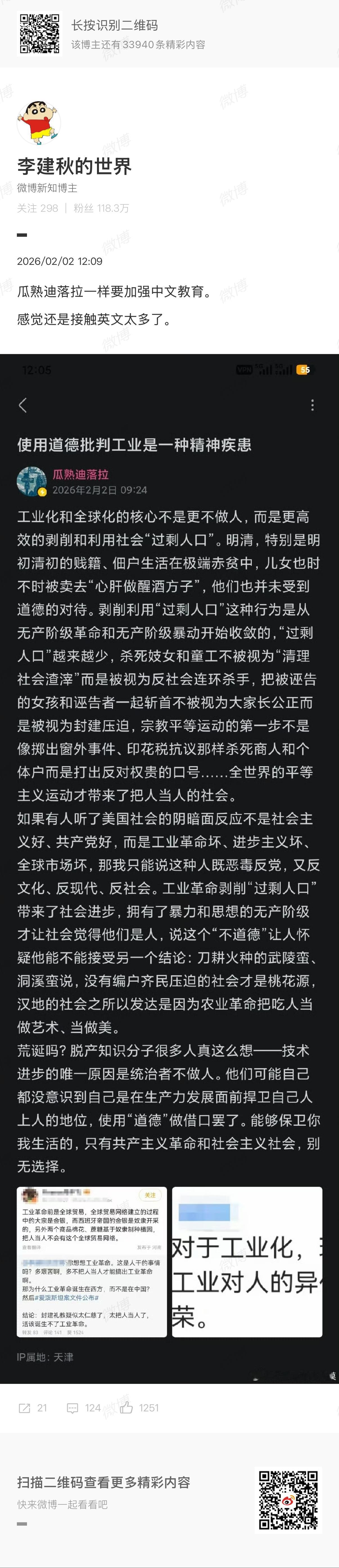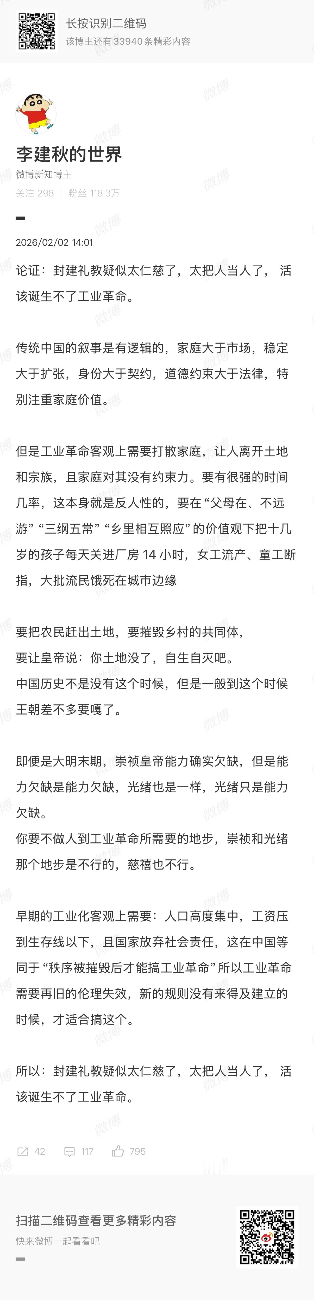 🔻超短篇。🔻看刘老师和瓜哥隔空吵工业革命的问题,在图1说了一点,再帮补充一下:🔻中国近代为什么搞不起工业革命?因为工业革命首先要解决失地农民吃饭的问题。🔻大明王朝1566里,为什么改稻为桑走不通?因为古代王朝里的农民不种地,就要花钱买口粮,而中国这个体量是无法靠贸易来解决吃饭问题的,没粮要饿死人,几个县闹起来地方官就要受不了,要从几个省的剩余口粮里挤出粮食来,如果挤不出来,农民起义就出现了。🔻所以中国古代和近代的几亿农民是被困死在土地上的,一点点手工业都只能靠农闲时期才能发展,更别提商品循环,不解决中国失地农民的吃饭问题,工业革命就无法诞生在近代中国。🔻英国不一样,首先英国人少,其次还有残酷的海外殖民输血——海外殖民是一种循环,被人为制造的债务破产者被迫投身又苦又累又危险的海外殖民事业,去更残酷的压榨被殖民地人民,使用奴隶低成本榨取殖民地财富。🔻最后就是大英帝国不把所有人当人,包括殖民地人民、奴隶、爱尔兰人乃至英国人,统统不当人,尤其是英国人和爱尔兰人,什么4岁小孩工龄2年,什么童工人均寿命10岁,这是系统性地以百万计人口的生命为代价,换取资本积累与劳动力转化,这是一种残酷的内部剥削、外部掠夺、债务驱动的破产以及强制性扩张。🔻直到工业革命带来了更多的生产力,直到更少的农民能种出更多的粮食,直到更多的殖民地财富被纳入了英国的财政循环,直到更温顺更不会反抗的维多利亚严选白羽人最终被选育成功,英国的工业革命就完成了。🔻英国菜为什么难吃?说不定就是大英帝国舍得虐待老百姓,长期喂维多利亚严选白羽人吃猪食留下来的非物质文化遗产。🔻而这样对我们的老祖宗就不行,老祖宗会反的。🔻要先让中国工业化,就要让工业化解决低水平农业的问题,这个问题首先是工业化发展水平高低的问题,同时依然是需要痛苦积累、艰难忍耐的问题,尤其是我们近代缺乏对外殖民掠夺的路径,这也让中国近代搞工业革命成为一个客观唯物上就不可能实现的问题。🔻工业化当然是残酷的,饿着肚子搞工业,是后发国家的必经之路,我们的人民做好了忍受痛苦的准备,咬着牙在艰难的奋斗中靠当了裤子实现了基本工业化,又靠当了裤子的基本工业化反哺了农业,提升了农业生产力和生产率,终于能让部分农民离开土地走进工厂,最终走上了工业化发展的快车道,所以商品经济也有了大发展,走向了正循环。🔻这个过程需要中国历史上前所未有的组织度,上下齐心的决心、勇气和忍耐,还需要人类的工业水平进入新的阶段,这是近代中国和所处的历史时代所不具备的。近代仁人志士尝试过的各种其他道路都失败了。🔻我们的祖宗选择了农业文明,不是因为不想,而是历史发展到特定阶段,能走通的就只有这一条路而已。🔻没有什么是理所当然,每一份命运的馈赠都已标好了价格,一切都有代价。只是有些年轻的孩子太幸福,他们幸福的代价,能给中国人拼出一个自己选择发展道路的机会,这是1840年以来几代中国人用血泪和汗给后代付了。🔻有些国家不想得到工业化和现代化吗?它们连付代价的资格都没有。🔻我们中国人自己拼出来的。热点现场海外新鲜事
