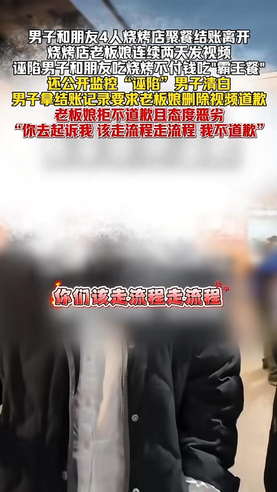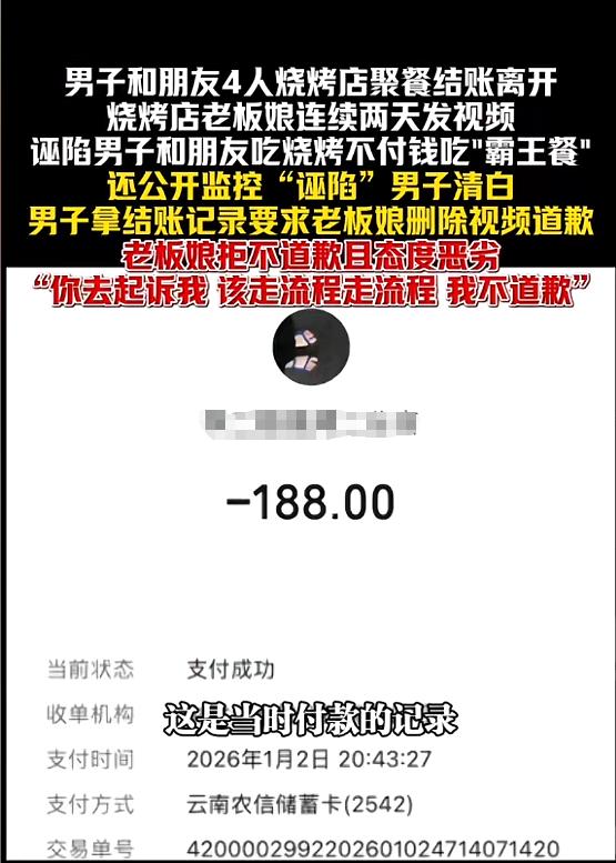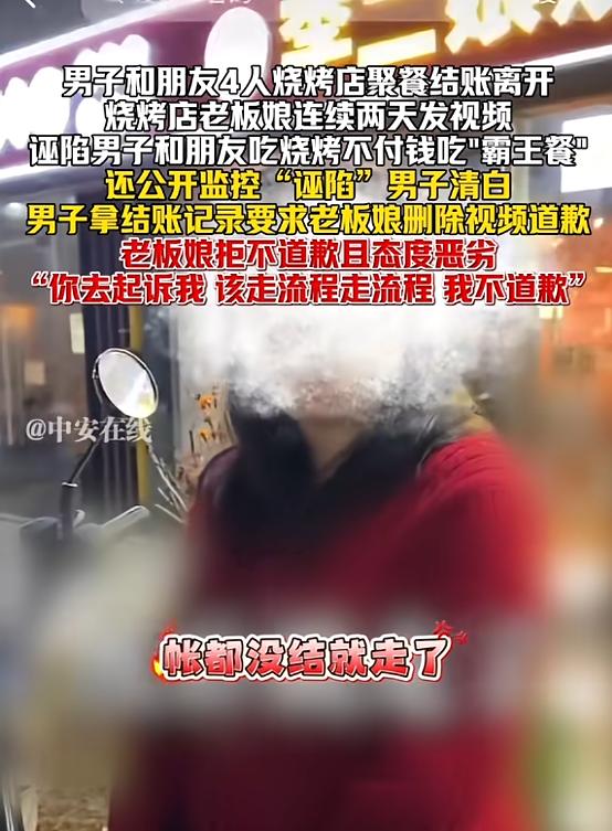 “脸都不要了!”近日,云南,一男子和朋友去烧烤店聚餐,吃完后结账离开,没想到烧烤店老板娘连续两天发视频,诬陷男子和朋友吃“霸王餐”,男子拿证据要求老板娘删除视频并道歉,但老板娘拒不道歉,还让男子去起诉她!网友:生意不想做了? 云南当地一家街边烧烤店,傍晚时分,男子约了几位朋友聚餐,想着就近找家烧烤店小聚畅谈,便走进了这家门店。 几人入座后,点了一堆烧烤和饮品,边吃边聊,全程氛围都很融洽,丝毫没和店家发生任何争执,也没提出过任何不合理要求。 聚餐结束后,男子主动起身去前台结账,核对好消费明细后,当场通过手机转账结清了所有费用,还特意确认了收款记录, 看到老板娘的手机显示收款成功后,才和朋友放心离开,全程干脆利落,没有半点拖沓,压根没料到后续会遭遇离谱的诬陷。 离开烧烤店后,男子和朋友各自回家,渐渐淡忘了这场聚餐,直到第二天,有朋友给男子发消息,说刷到了一条诬陷他的视频。 男子赶紧点开查看,发现视频是那家烧烤店的老板娘所发,视频里不仅隐晦提及他和朋友的外貌特征,还直言几人吃烧烤不给钱,恶意逃单吃“霸王餐”,语气里满是指责。 更让男子气愤的是,老板娘并没有就此收手,反而连续两天发布相关视频,还转发到了当地多个社群, 一时间,不少不明真相的网友留言议论,甚至有人根据视频里的描述猜测男子的身份,给男子的生活带来了不小的困扰,也损害了他的个人名誉。 男子又气又无奈,当即翻找出当时的手机转账记录、付款凭证,还有同行朋友的证言,整理好所有证据后,专程赶到那家烧烤店,找到老板娘对峙,要求她立即删除所有诬陷视频,公开向自己和朋友道歉,消除不良影响。 可面对铁证如山,老板娘依旧态度强硬,没有丝毫愧疚之意,既不承认自己诬陷他人,也拒绝删除视频、道歉,全程敷衍应对。 面对男子的反复要求,老板娘更是摆出一副无所谓的姿态,直接叫男子去法院起诉,直言“该走流程走流程,我不道歉”,嚣张的态度让人难以接受。 男子当场反驳,明确告知老板娘,自己已经结清所有费用,她的诬陷行为已经损害了自己的名誉,可老板娘根本不予理会,依旧我行我素。 据悉,商家公开捏造事实诬陷消费者,导致消费者社会评价降低,已涉嫌侵犯消费者名誉权,消费者有权要求商家停止侵害、恢复名誉、消除影响并赔礼道歉,甚至可以要求赔偿损失。 男子表示,自己从未见过这么不讲理的商家,结清账单却遭恶意诬陷,对方还拒不认错,实在让人无法容忍。 目前,他已经留存好所有相关证据,包括老板娘发布的诬陷视频、转账记录、沟通录音等,准备通过合法途径维权,坚决讨要说法,捍卫自己的合法权益和名誉。 后来,男子将自己的遭遇和相关证据分享到网上,迅速引发全网热议,网友们清一色站在男子这边,怒斥老板娘不讲诚信、恶意诬陷,吐槽“为了博眼球或泄私愤,连底线都没了,这生意迟早做黄”。 诚信是生意人的立身之本,恶意诬陷顾客不仅会砸了自己的招牌,还需承担相应的法律责任。对此,你们有什么看法,欢迎评论留言~