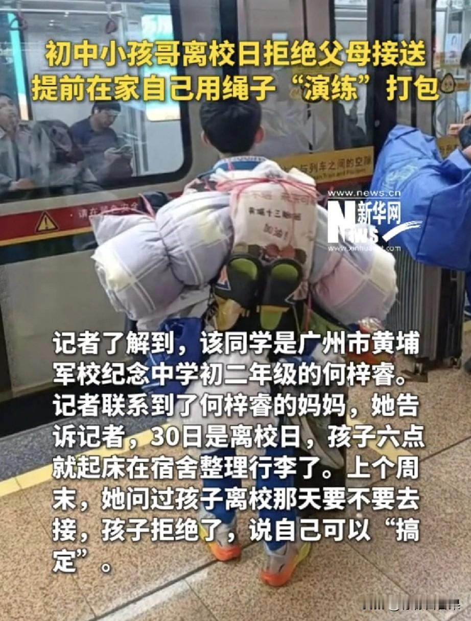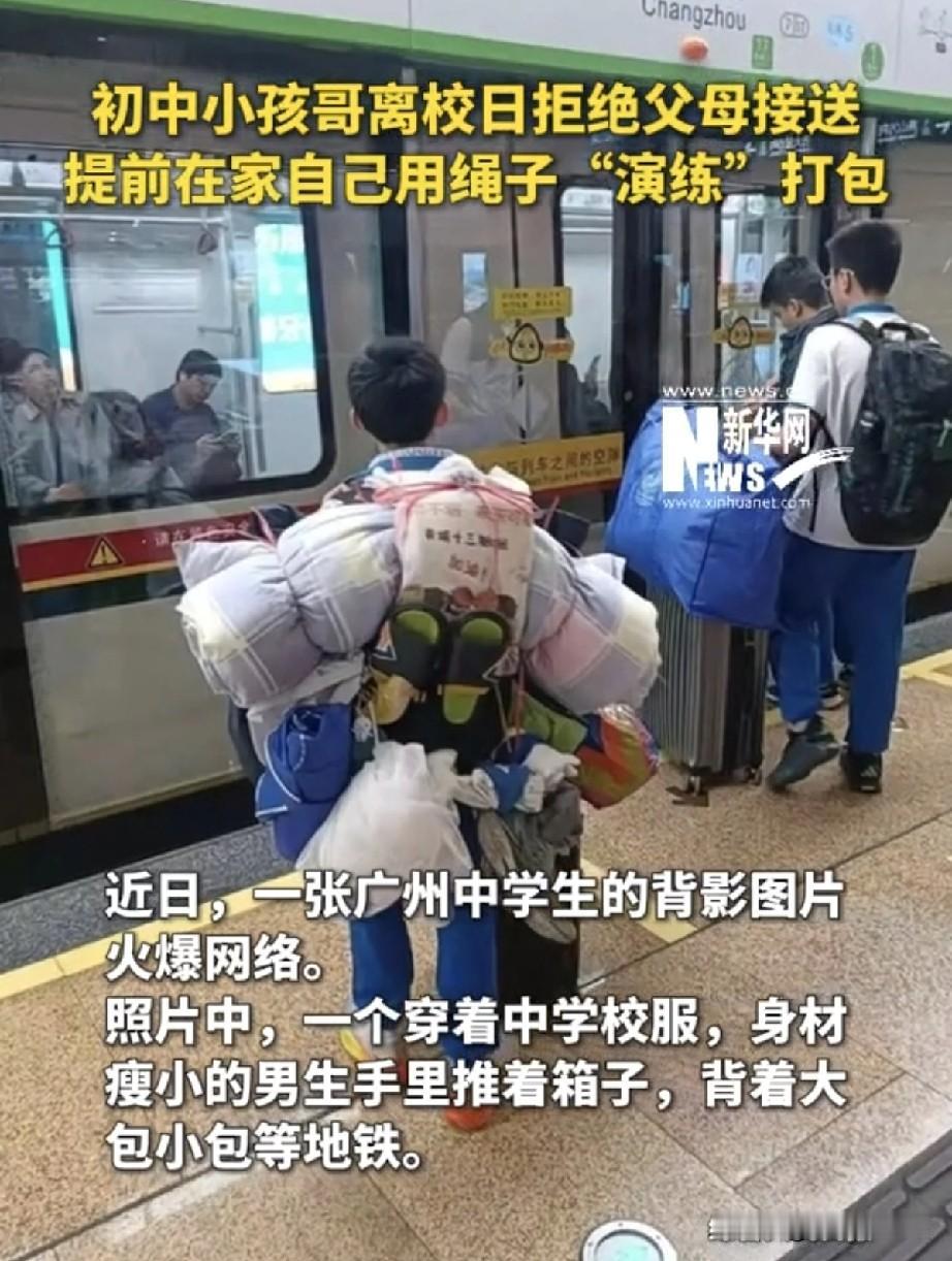 刷到这张图直接被戳中了!广州地铁站里,一个穿着初中校服的小孩哥,背着小山一样的大包小包,手里还推着行李箱,正淡定地等地铁。 离校日直接拒绝了爸妈的接送。提前在家用绳子“演练”打包,把被褥、蚊帐、竹席全捆成了“小山”,自己背在身上,手里还推着行李箱,淡定去坐地铁。 关键这不是他第一次这么干!上学期放假就用同样的方式,把竹席、书架都背回了家。更牛的是,他还会做针线活,妹妹扯烂的蚊帐、自己开线的书包,全是他亲手缝的。 家长说他们的教育理念就是“只陪伴不插手”,只要安全,就鼓励孩子自己解决问题。 看看这孩子的背影,再想想身边不少连书包都要家长拎的娃,我们是否也该反省对孩子的教育,应该多让孩子独立完成力所能及的事,培养孩子的主动性和独立性。 孩子终要独自面对世界,我们的使命不是“把他护在怀里”,而是“教他学会奔跑”。 你们觉得呢?