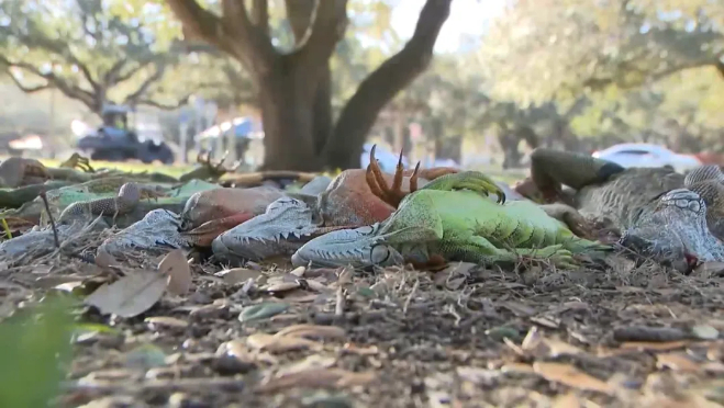 在佛州,气象学家报告,该州南部部分地区气温甚至跌破零摄氏度,而相关地区上一次出现这样的低温是1989年。有关方面警告称,风寒效应甚至可能危及生命。由于气温大降,佛罗里达州再现“天降蜥蜴”景象,不少僵硬的蜥蜴直挺挺地从树上落下。这种冷血动物依赖阳光来调节体温与生理机能。当气温降至约4摄氏度或更低时,鬣蜥的肌肉开始“僵硬”,会因抓不住树枝而从树上摔落。