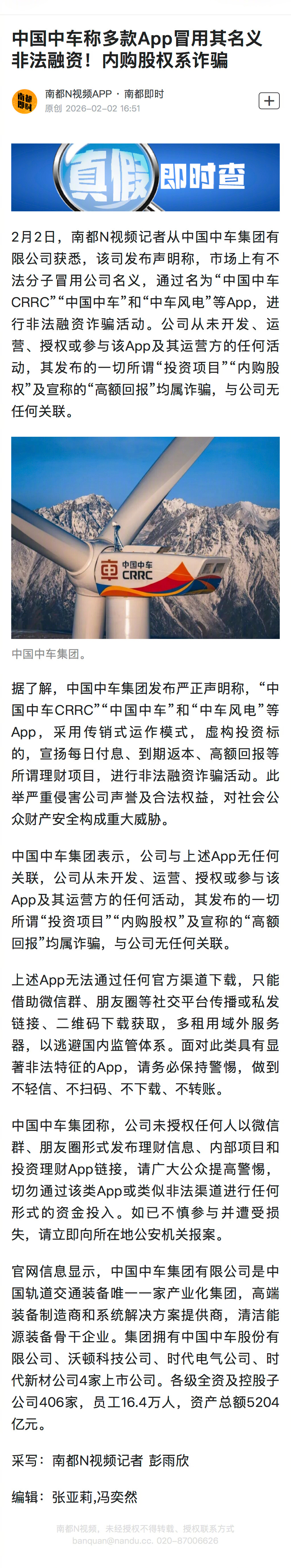 #中国中车声明多款App系诈骗#【中国中车称多款App冒用其名义非法融资!内购股权系诈骗】2月2日,南都N视频记者从中国中车集团有限公司获悉,该司发布声明称,市场上有不法分子冒用公司名义,通过名为“中国中车CRRC”“中国中车”和“中车风电”等App,进行非法融资诈骗活动。公司从未开发、运营、授权或参与该App及其运营方的任何活动,其发布的一切所谓“投资项目”“内购股权”及宣称的“高额回报”均属诈骗,与公司无任何关联。南都N视频记者 彭雨欣