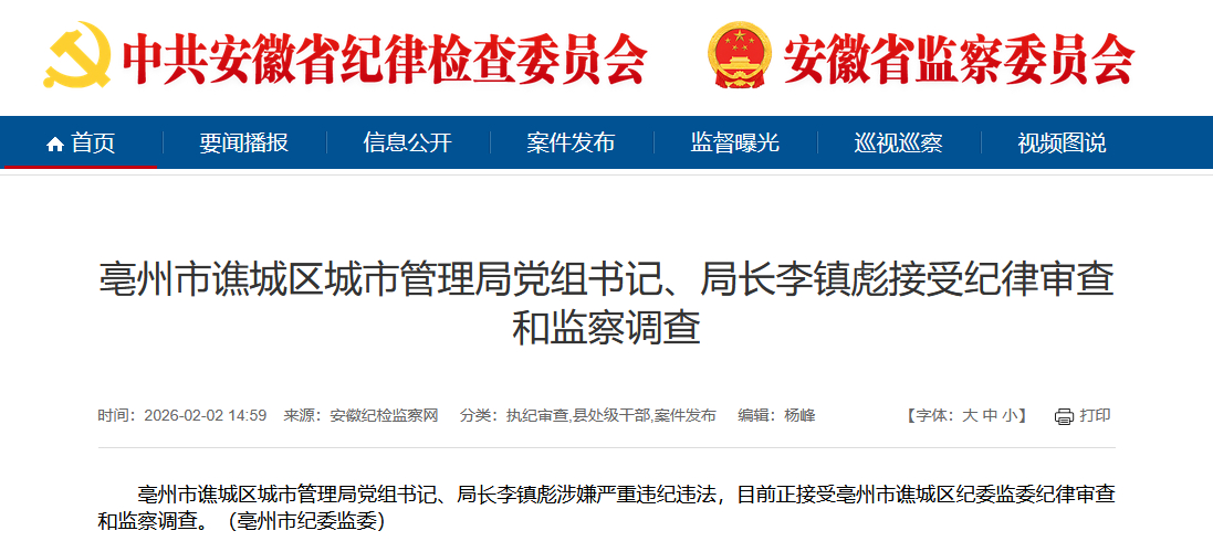 【#亳州市谯城区城管局局长李镇彪被查#】#安徽反腐快讯# 亳州市谯城区城市管理局党组书记、局长李镇彪涉嫌严重违纪违法,目前正接受亳州市谯城区纪委监委纪律审查和监察调查。(亳州市纪委监委)网页链接