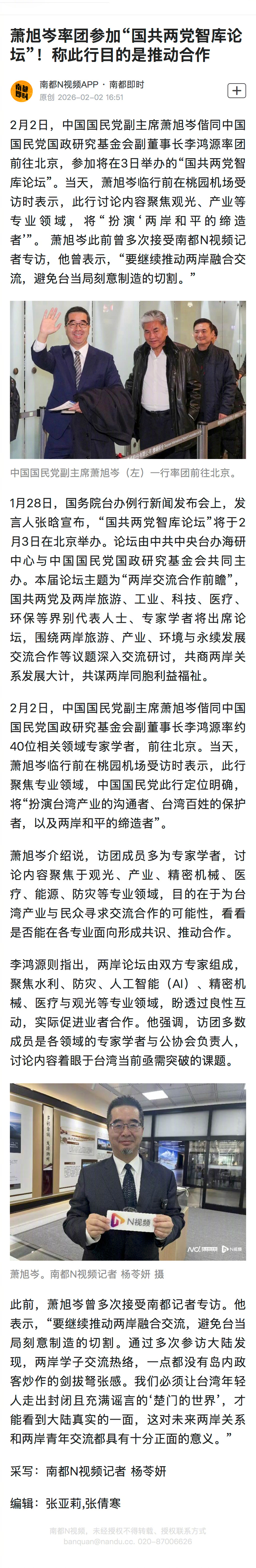 #萧旭岑率团参加国共两党智库论坛#【萧旭岑率团参加“国共两党智库论坛”!称此行目的是推动合作】2月2日,中国国民党副主席萧旭岑偕同中国国民党国政研究基金会副董事长李鸿源率团前往北京,参加将在3日举办的“国共两党智库论坛”。当天,萧旭岑临行前在桃园机场受访时表示,此行讨论内容聚焦观光、产业等专业领域,将“扮演‘两岸和平的缔造者’”。 萧旭岑此前曾多次接受南都N视频记者专访,他曾表示,“要继续推动两岸融合交流,避免台当局刻意制造的切割。”南都N视频记者 杨苓妍