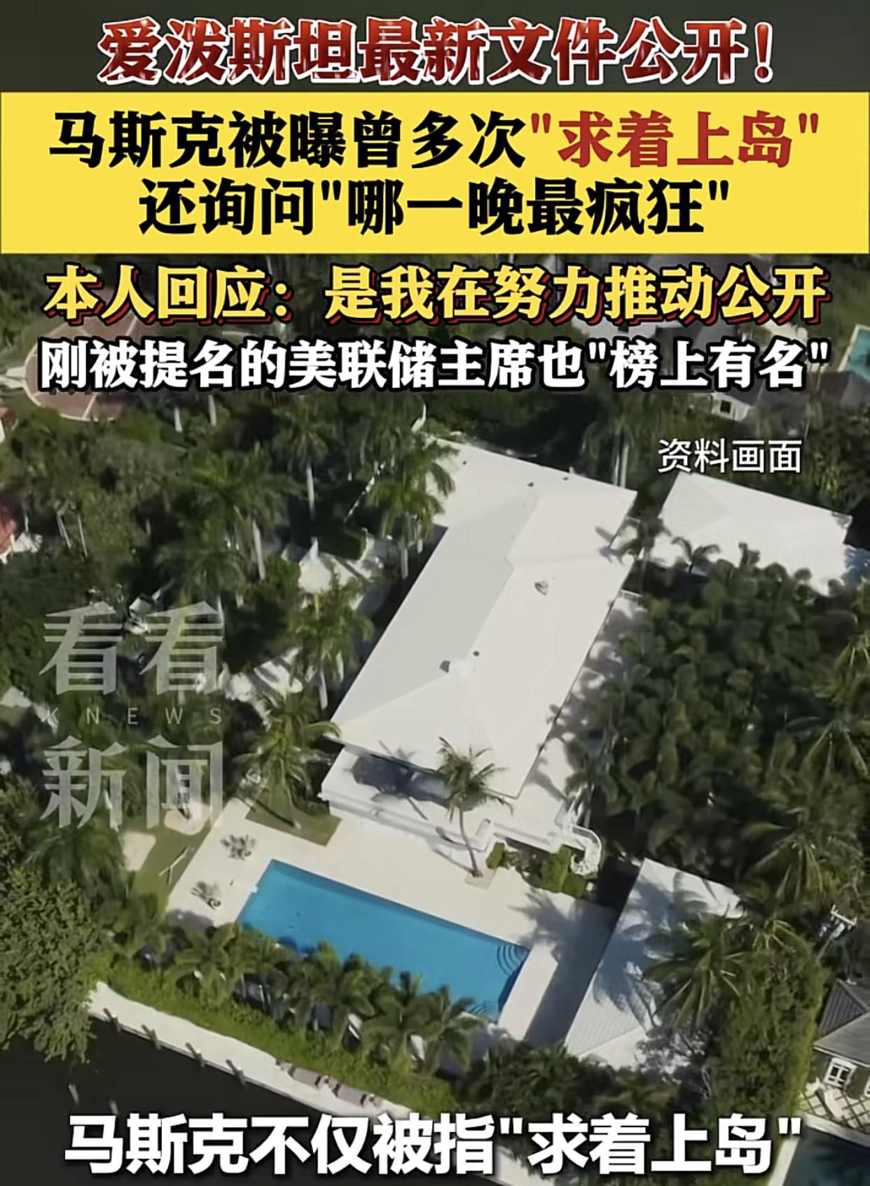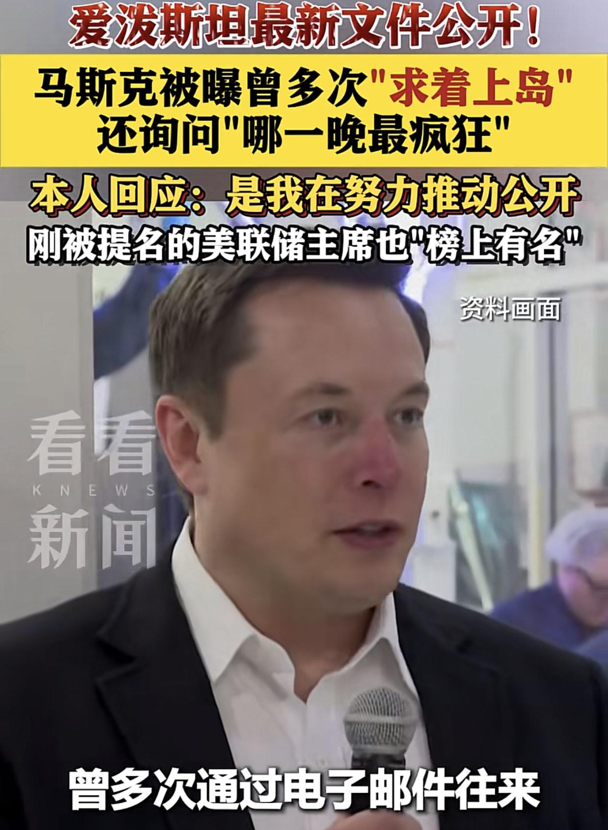 爱泼斯坦最新文件曝光,让世人震惊! 据悉马斯克在12-13年曾多次主动给爱泼斯坦发邮件,求着要求上岛玩!还问能带几个人玩,还说:“自己太忙,对一般的局没啥兴趣,但你这个私人岛屿就不一样,我对你这个局很有兴趣,不疯狂的我都不爱玩!” (来源:看看新闻) 记得有个采访马斯克的视频,说流浪汉无家可归冻死街口,问他有啥看法?马斯克居然没有展现出一丝同情。还有谁记得那个比利时女模特吗?看看她当时惊慌失措的从房子里跑出来冲大街上,从此渺无音讯,现在也披露她人在哪里,不会也人间蒸发了吧。