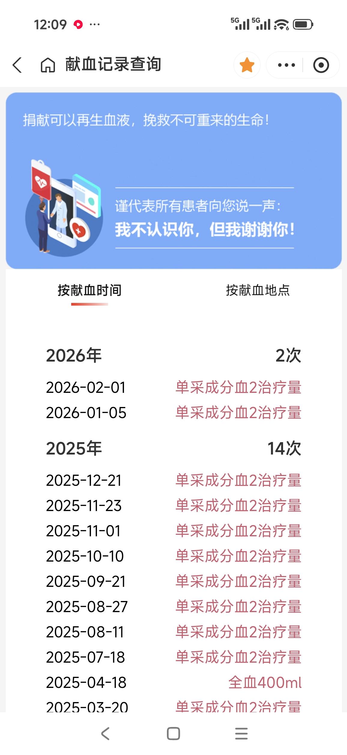 献血使生命延续,奉献让真情永存!截至2026年2月1日,本人已经无偿献血178次,全血6000毫升,成分血290个治疗量,总计72300毫升。五次荣获全国无偿献血奉献奖金奖,已经取得终身荣誉奖!