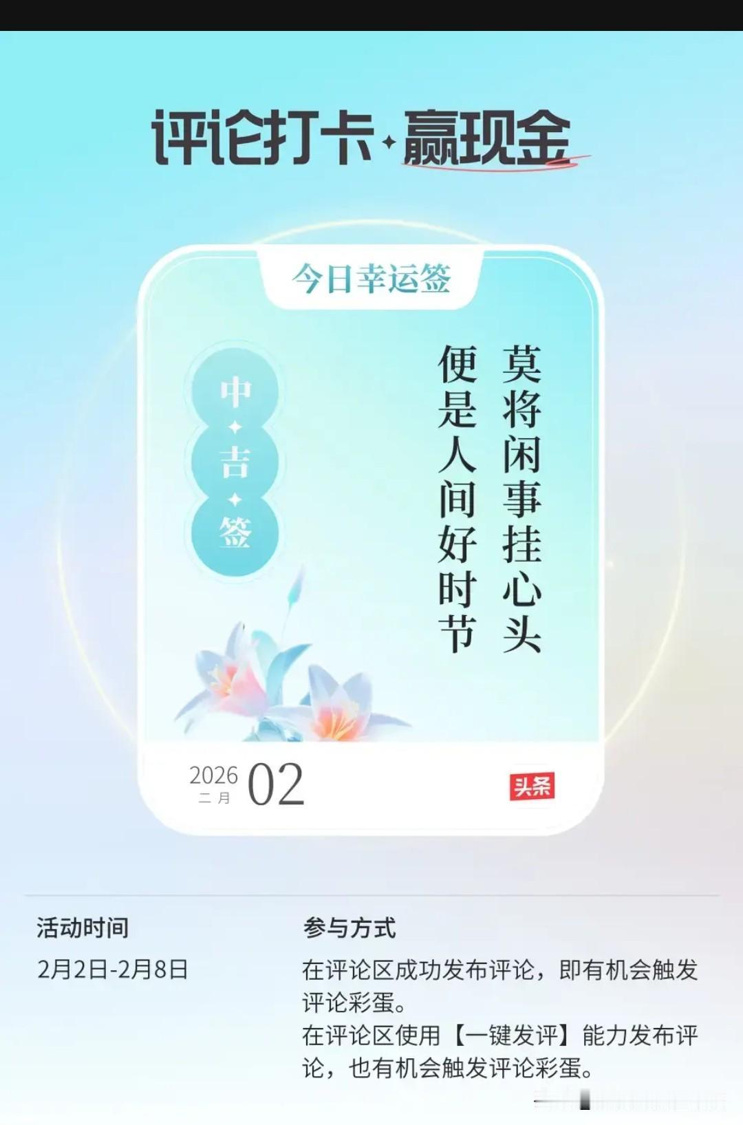 2月2日 腊月过半 年味渐浓 今日签文 “莫将闲事挂心头, 便是人间好时节。” 蓦地想起今早那段话 好运源于会笑的眼睛 不听是非的耳朵 和不说尖刻话的嘴 原来最踏实的福气 并非等来 是心宽一寸、善行一步 慢慢修来 腊月时光 满是奔赴新春的热望 茶汤暖 家人在 便是最好的光景 所谓“好运连连” 不过是烟火日常里的彼此陪伴 是心善、心正、心宽后 岁月给予的温柔回响 心宽一寸 福来一丈 愿我们都有会笑的眼睛 不说尖刻话的嘴 接住稳稳的好运 春来福气满门庭 腊月祝福语 年味话语
