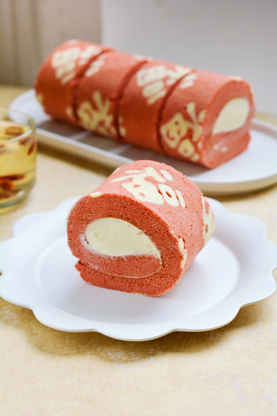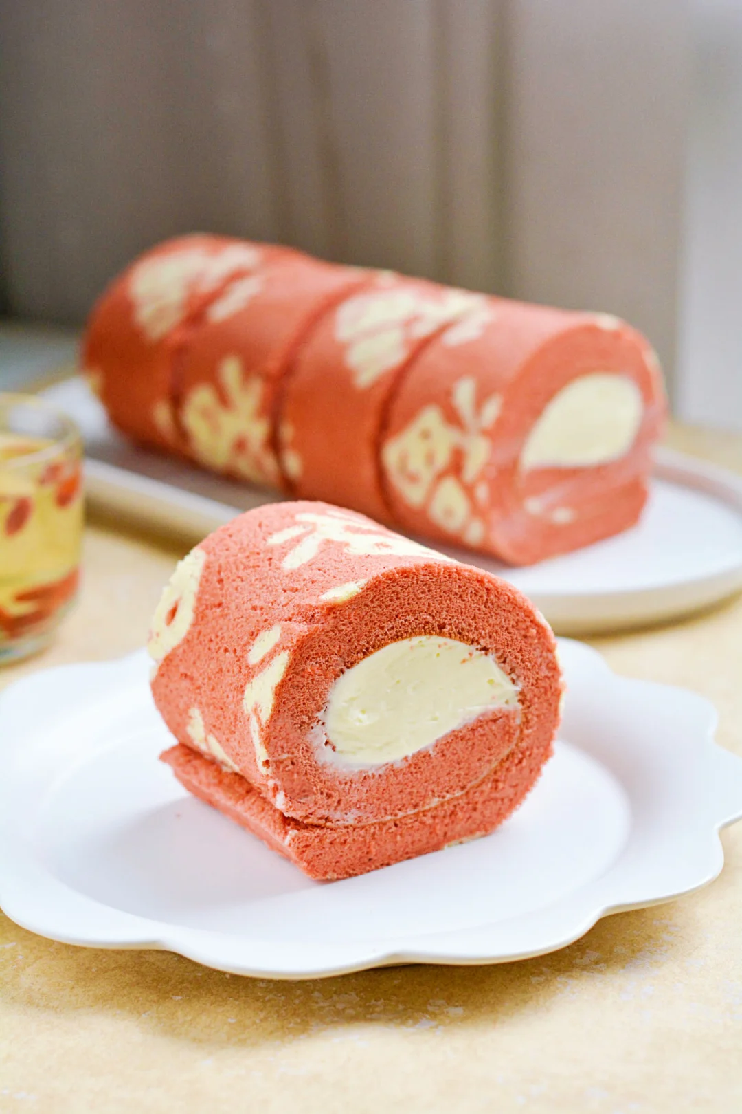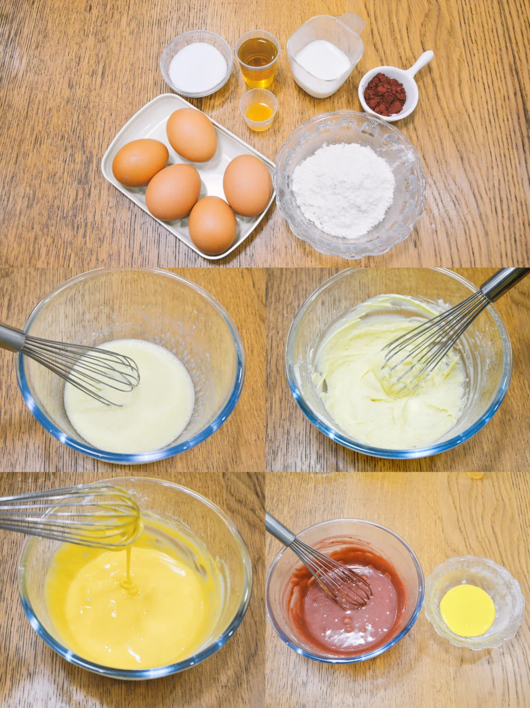 【蛋糕】中等鸡蛋5个,低筋面粉55克,细砂糖40克,柠檬汁5克,牛奶50克,玉米油40克,红曲粉5克